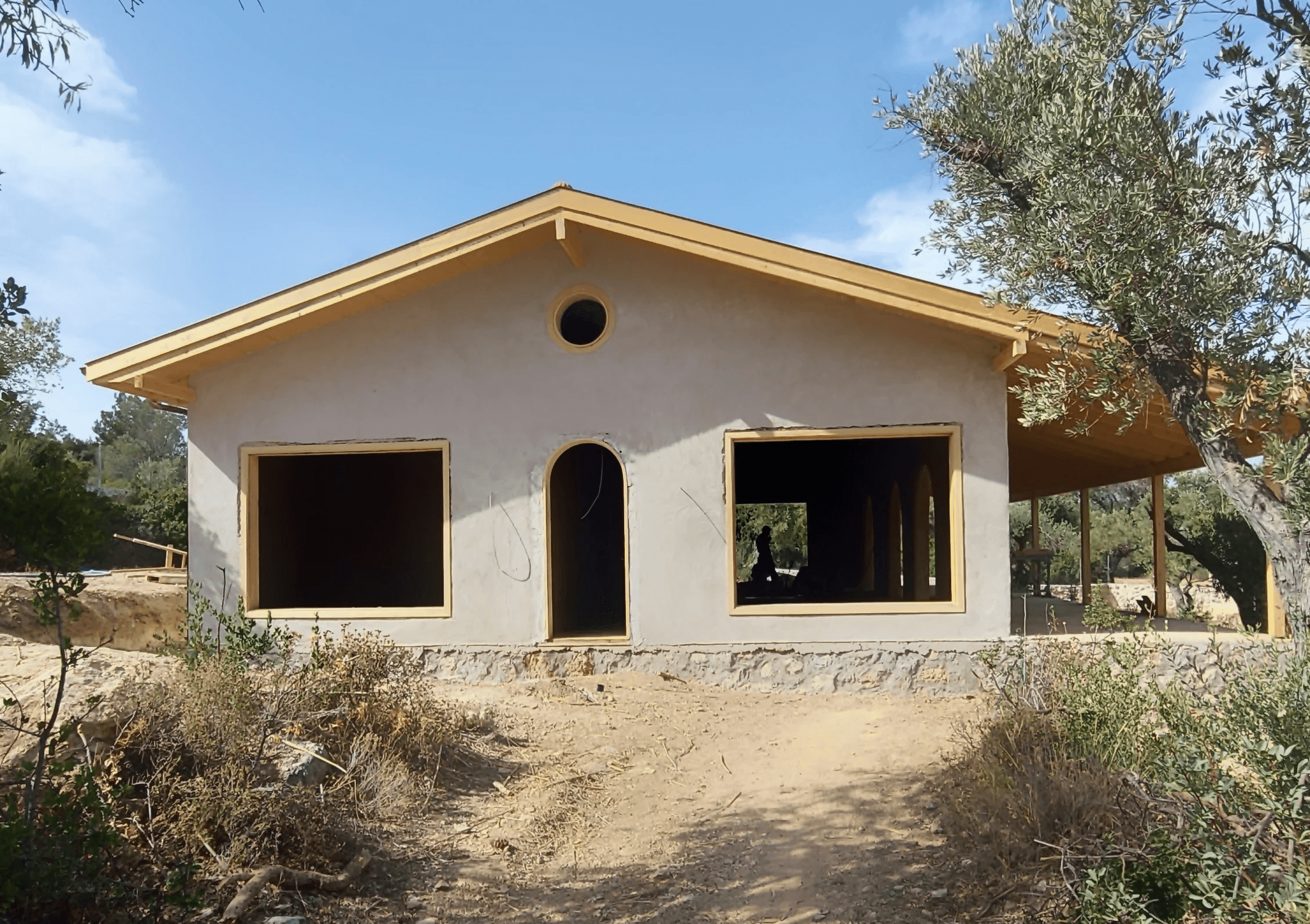 The design approach drew on passive house strategies to minimize energy demands. Openings were carefully placed to bring in natural light and cross-ventilation, while straw filled earthen walls and floor provide thermal stability. Rainwater harvesting, together with grey and black water reuse in the garden, reduces reliance on external water sources. These systems were integrated from the outset, making the house resilient to the site’s seasonal extremes.