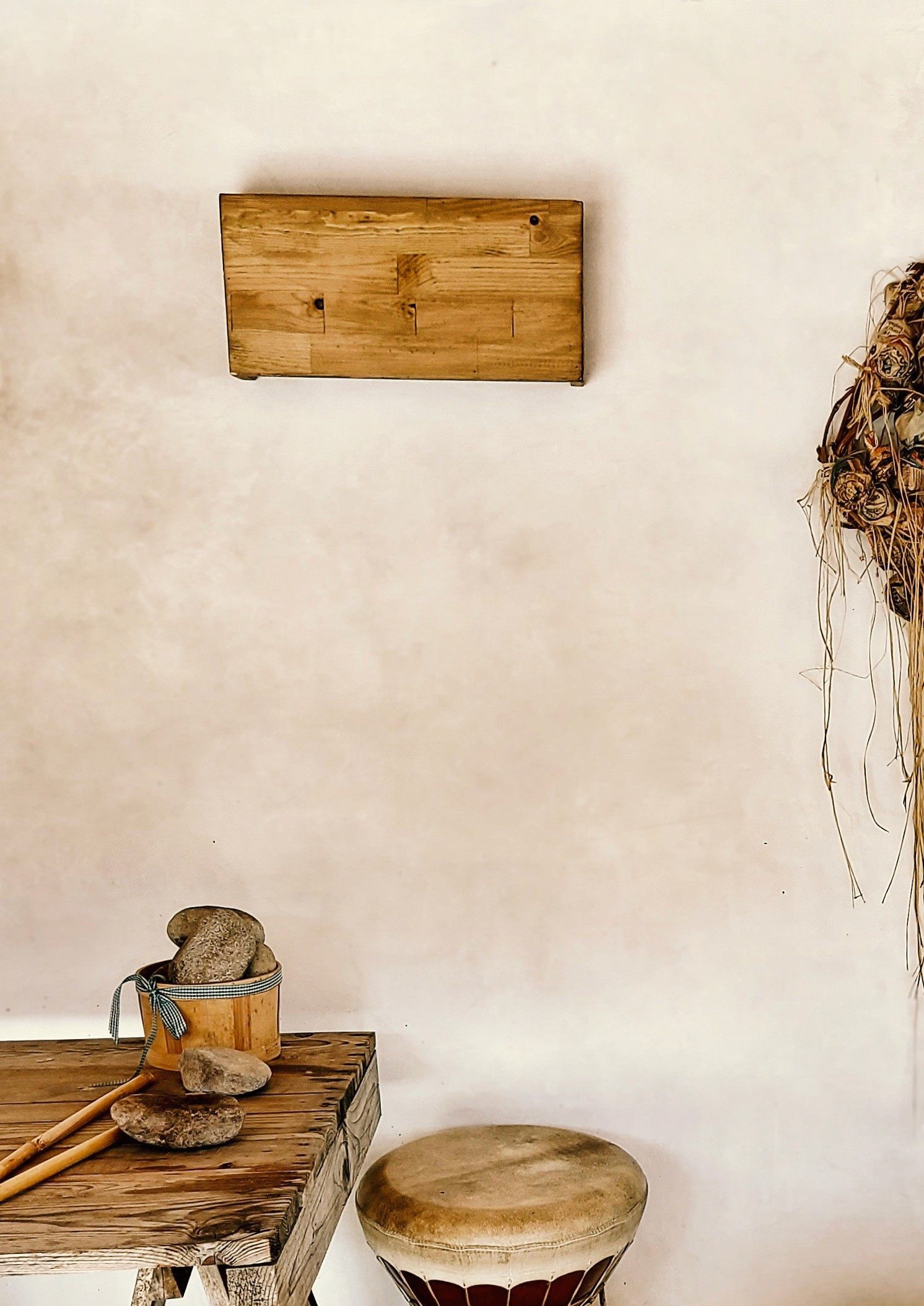 As part of the gallery’s design, textured lime plaster was applied to the interior and exterior walls of Kozalak Alaçatı. The textured surface created a natural backdrop for sculptural works, enhancing their material presence while linking the gallery space to the rural landscape and the earthy atmosphere of its surroundings. The partially open exhibition space required a surface that could breathe with seasonal humidity, complement natural light, and age gracefully over time. A mineral lime plaster was chosen to achieve these qualities, drawing on traditional Mediterranean craft while offering a neutral, warm-toned base for art display.
