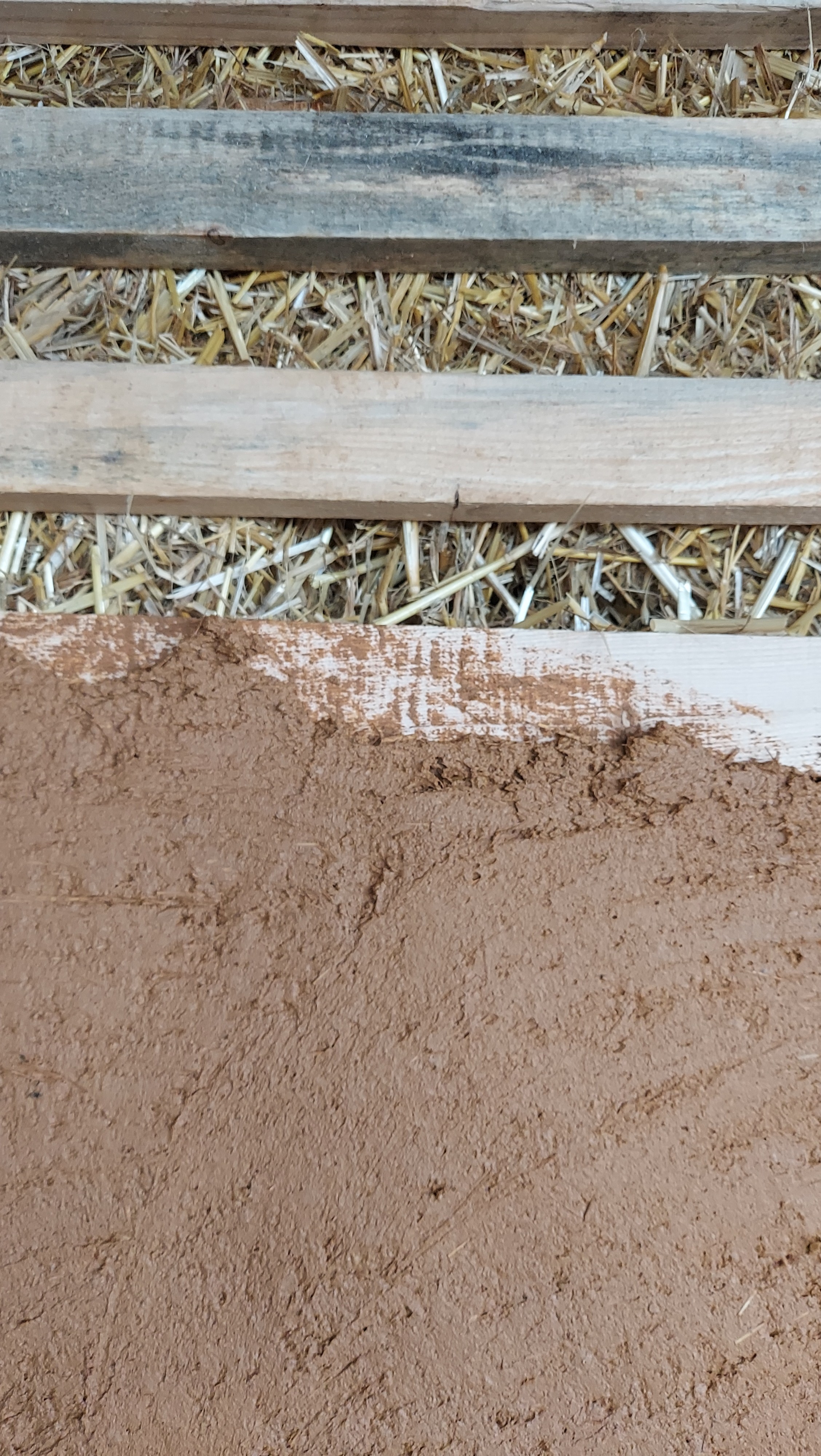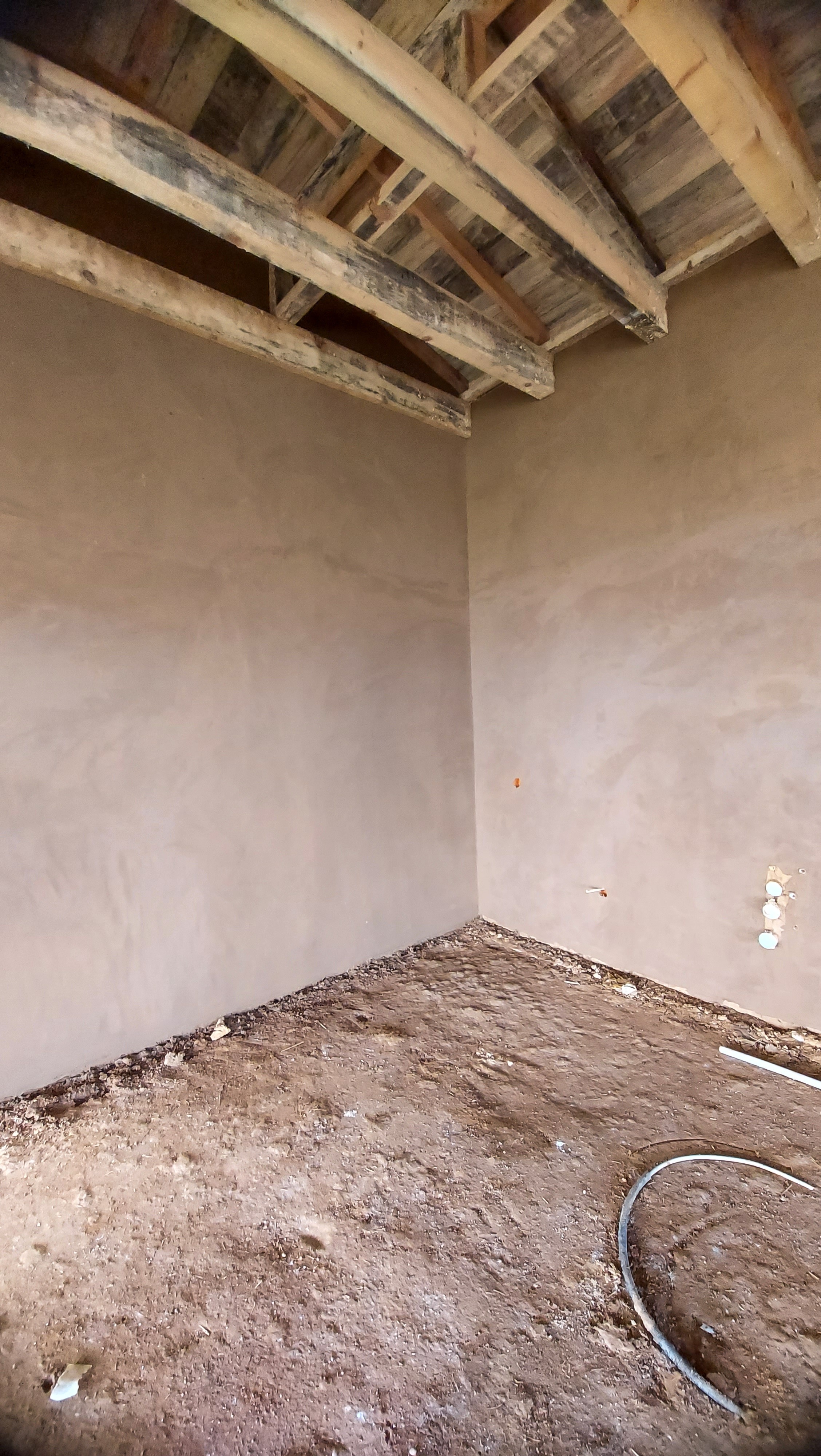 Interior walls were covered with earthen plaster applied over wooden laths, then finished with lime distemper paint, creating a warm, breathable surface with a matte finish.