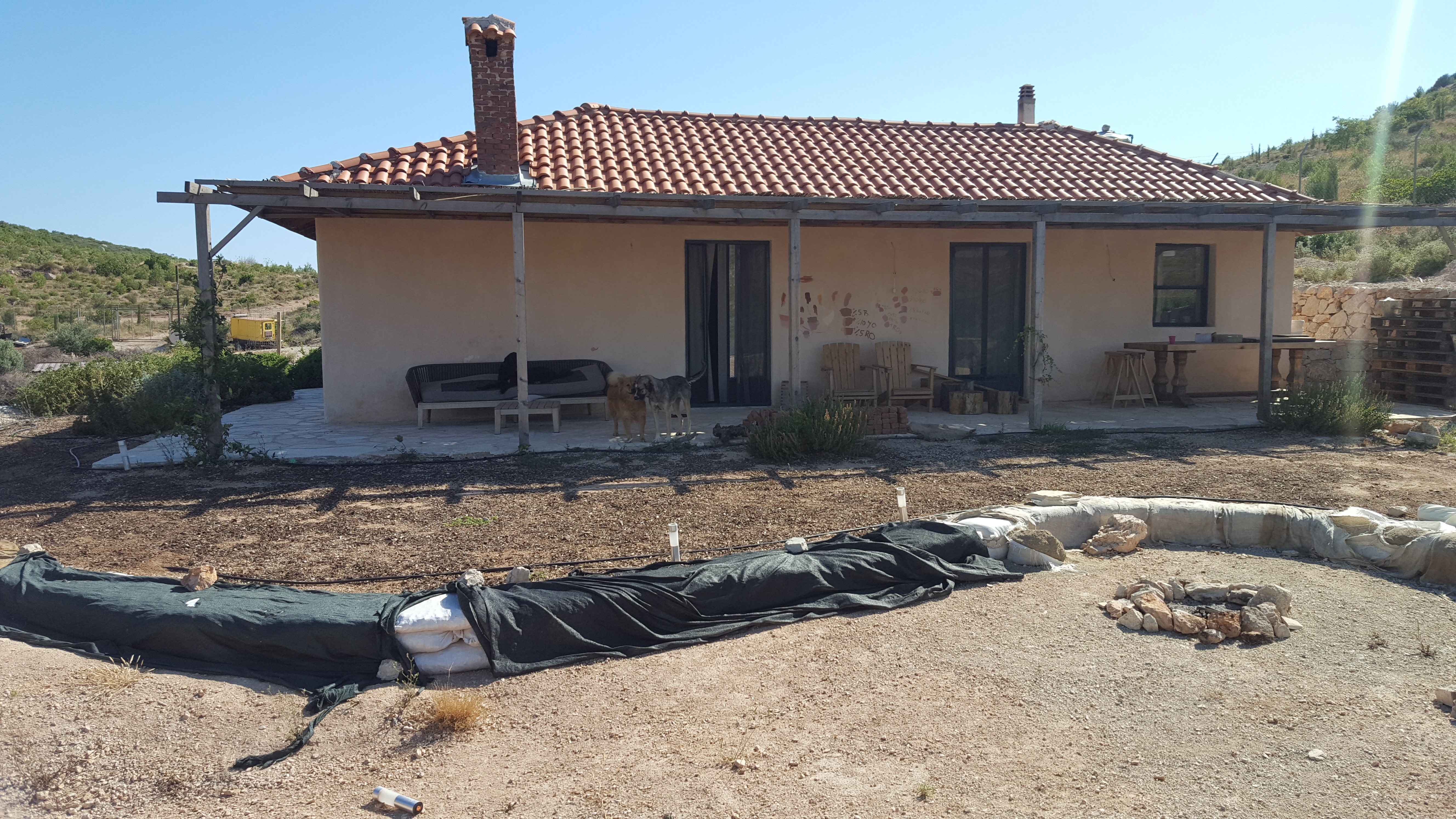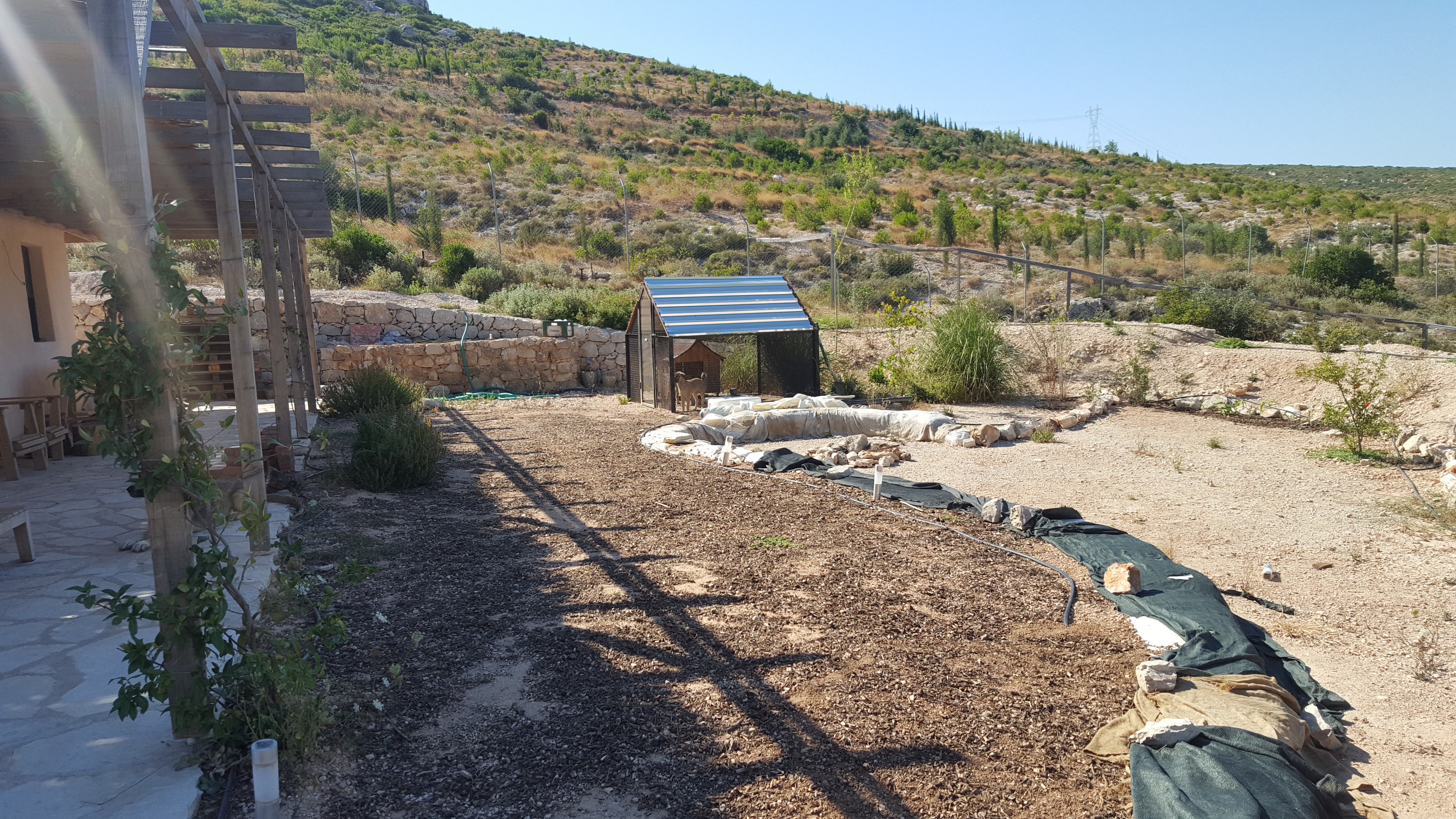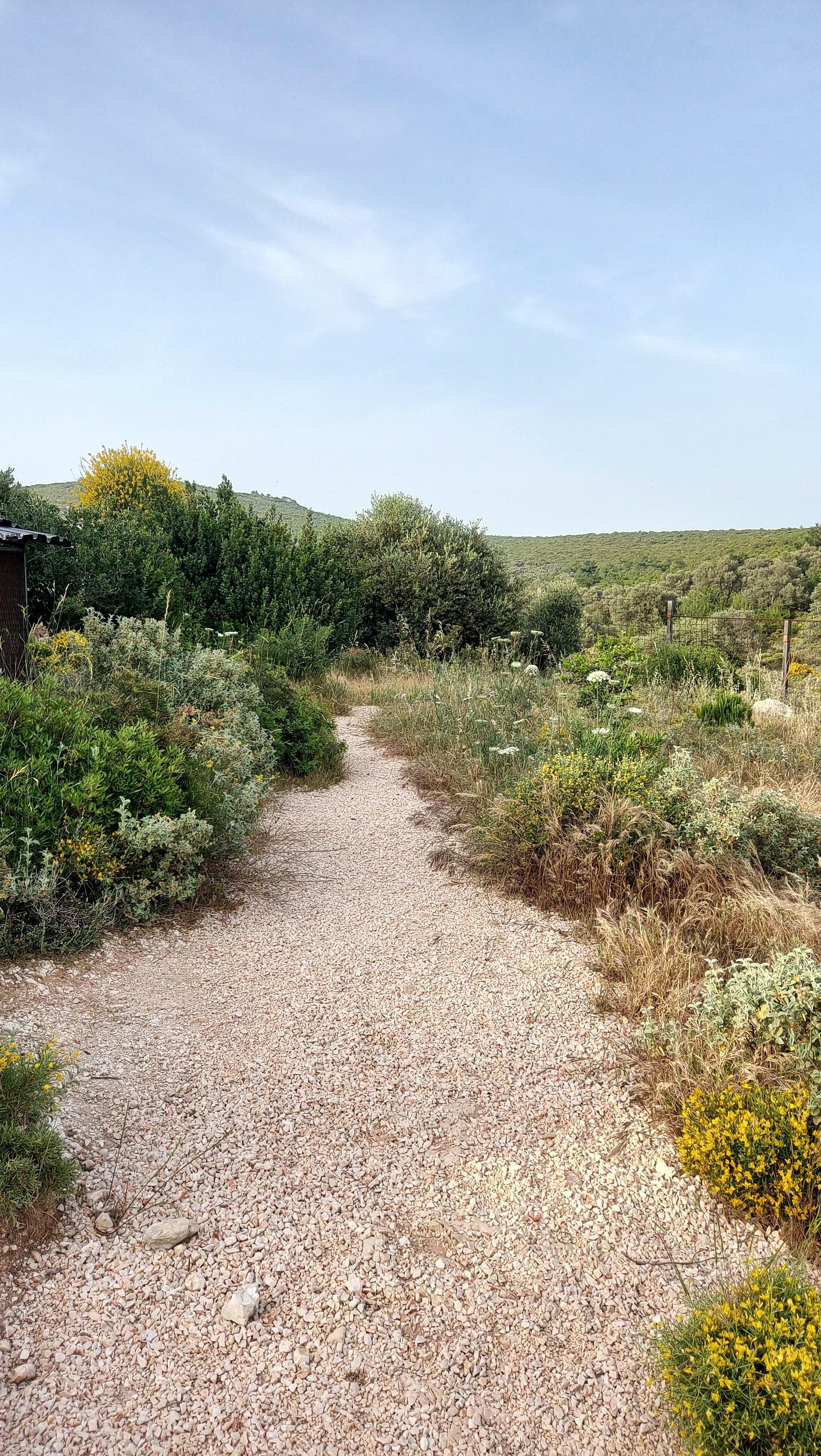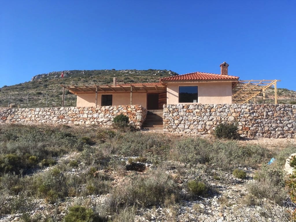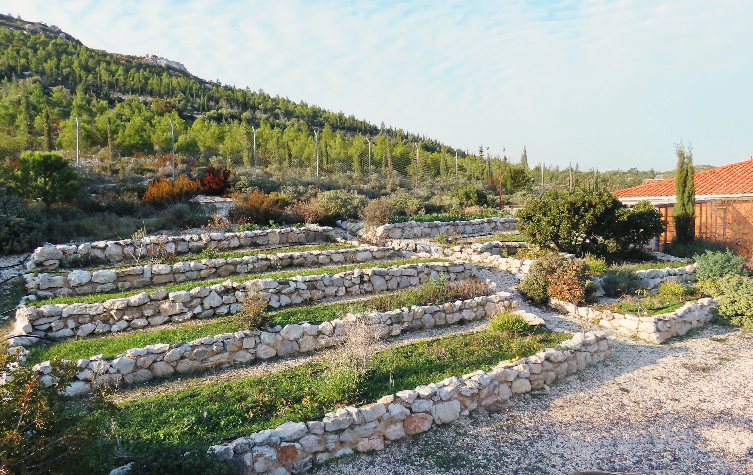 Planting was developed in continuity with the site’s ecology, using only local and climate-adapted species to maintain a balance between the forest edge and cultivated areas. Across the wider land, native trees such as mastic, olive, and carob were planted in keeping with the site’s existing vegetation. These species thrive without irrigation or maintenance, regenerate after fire, and provide long-term ecological and economic value while offering shelter and food for wildlife. Additional fruit trees and shrubs were introduced to complement this system and support small-scale food production.