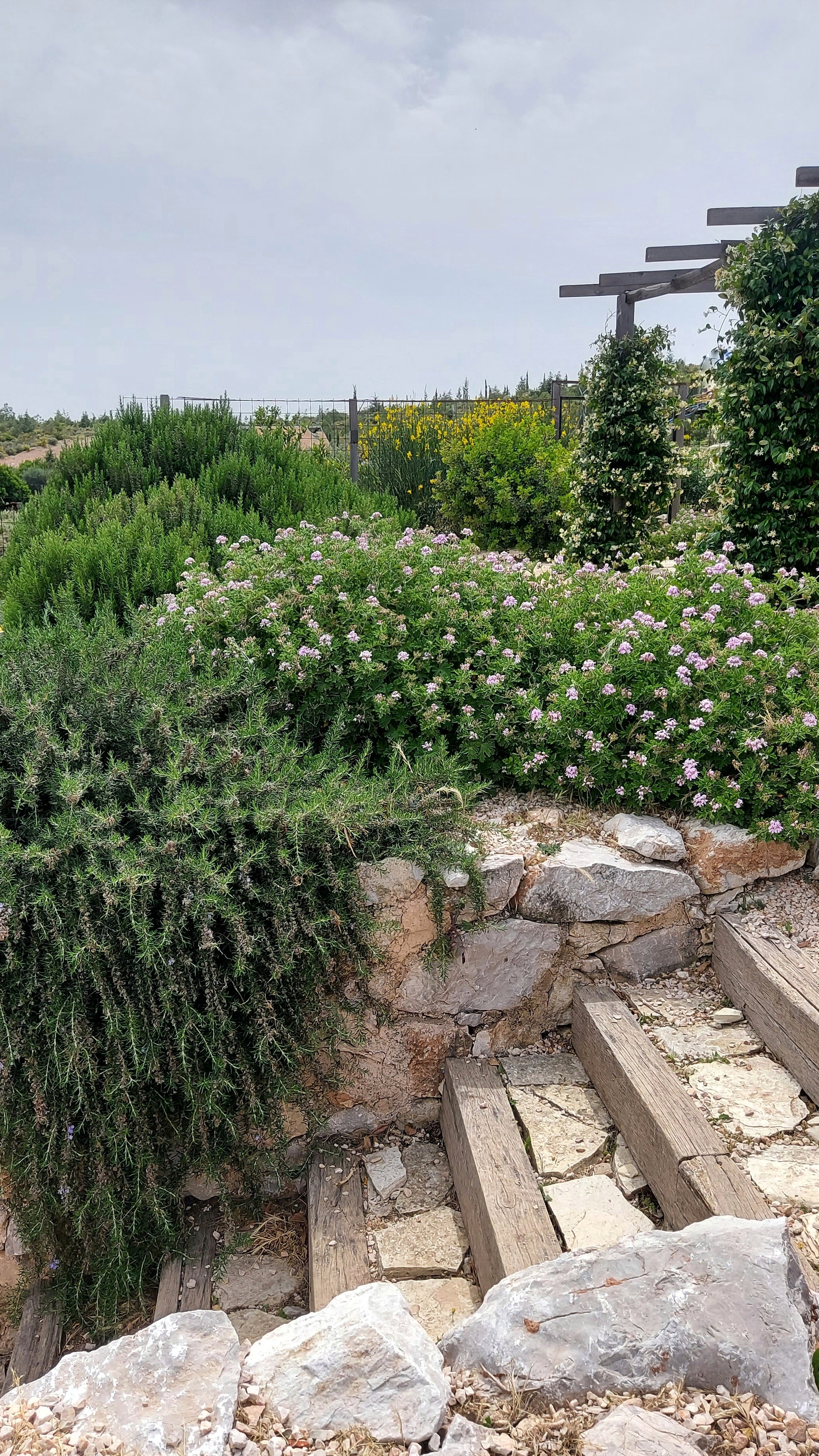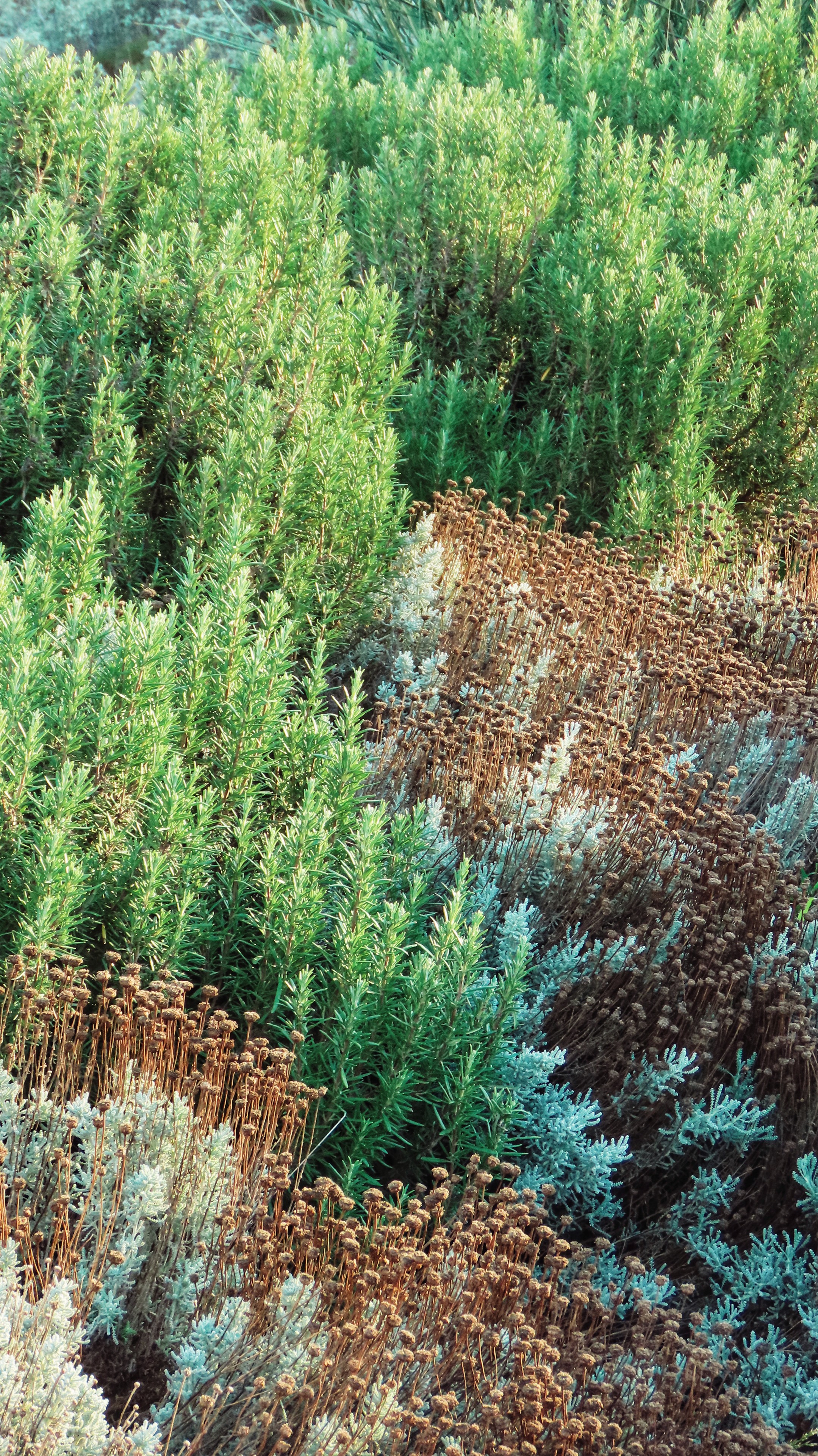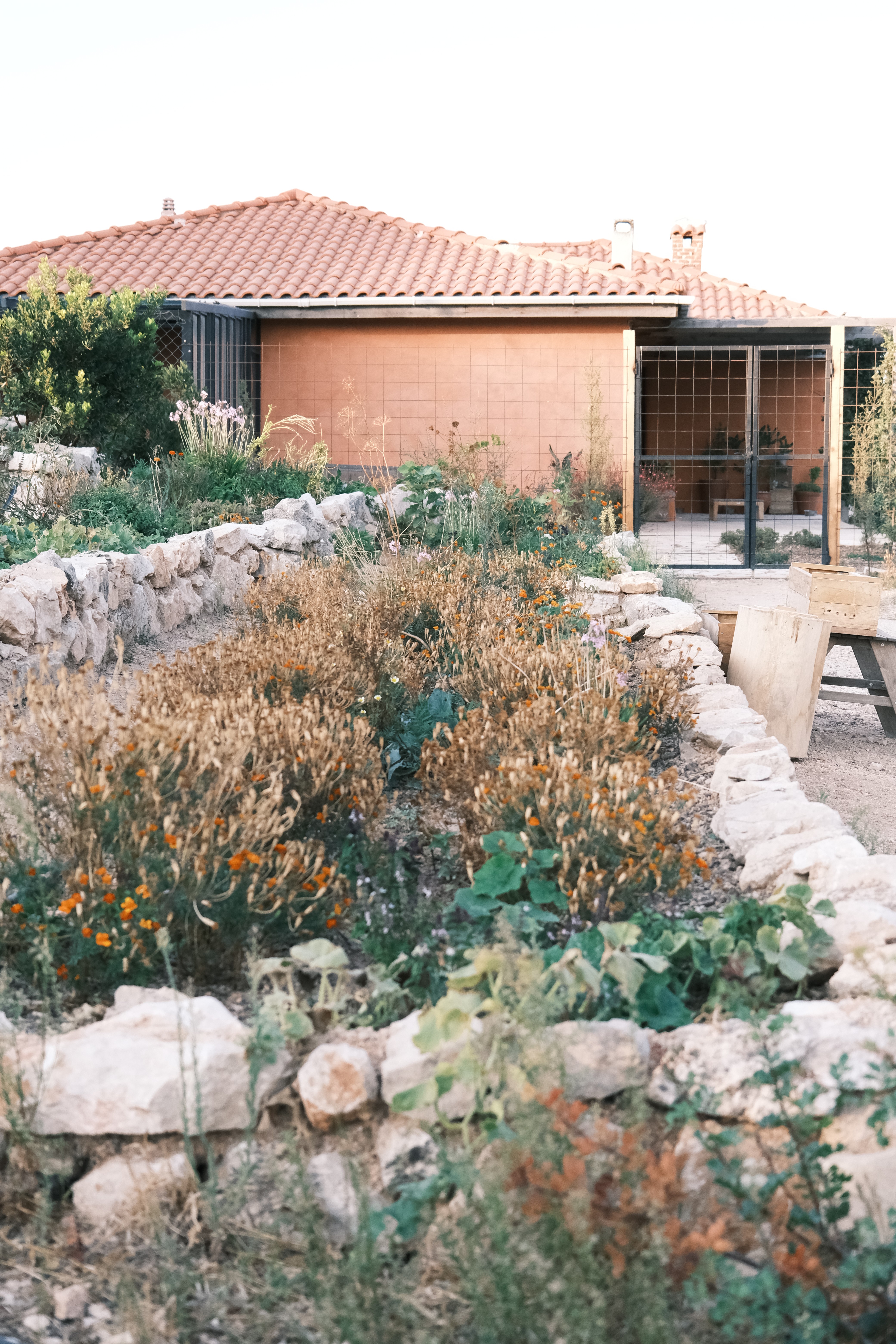 Closer to the living areas, planting shifts in scale and intention. Vegetable plots and garden spaces are integrated with outdoor kitchen, seating areas, and daily-use zones, forming a more intimate garden condition. Here, ornamental planting is guided by climate performance rather than appearance alone. Mediterranean herbs, wildflowers and drought-tolerant perennials were selected for their ability to attract pollinators, provide habitat, and thrive with minimal water, creating a garden that is visually rich while remaining ecologically grounded.