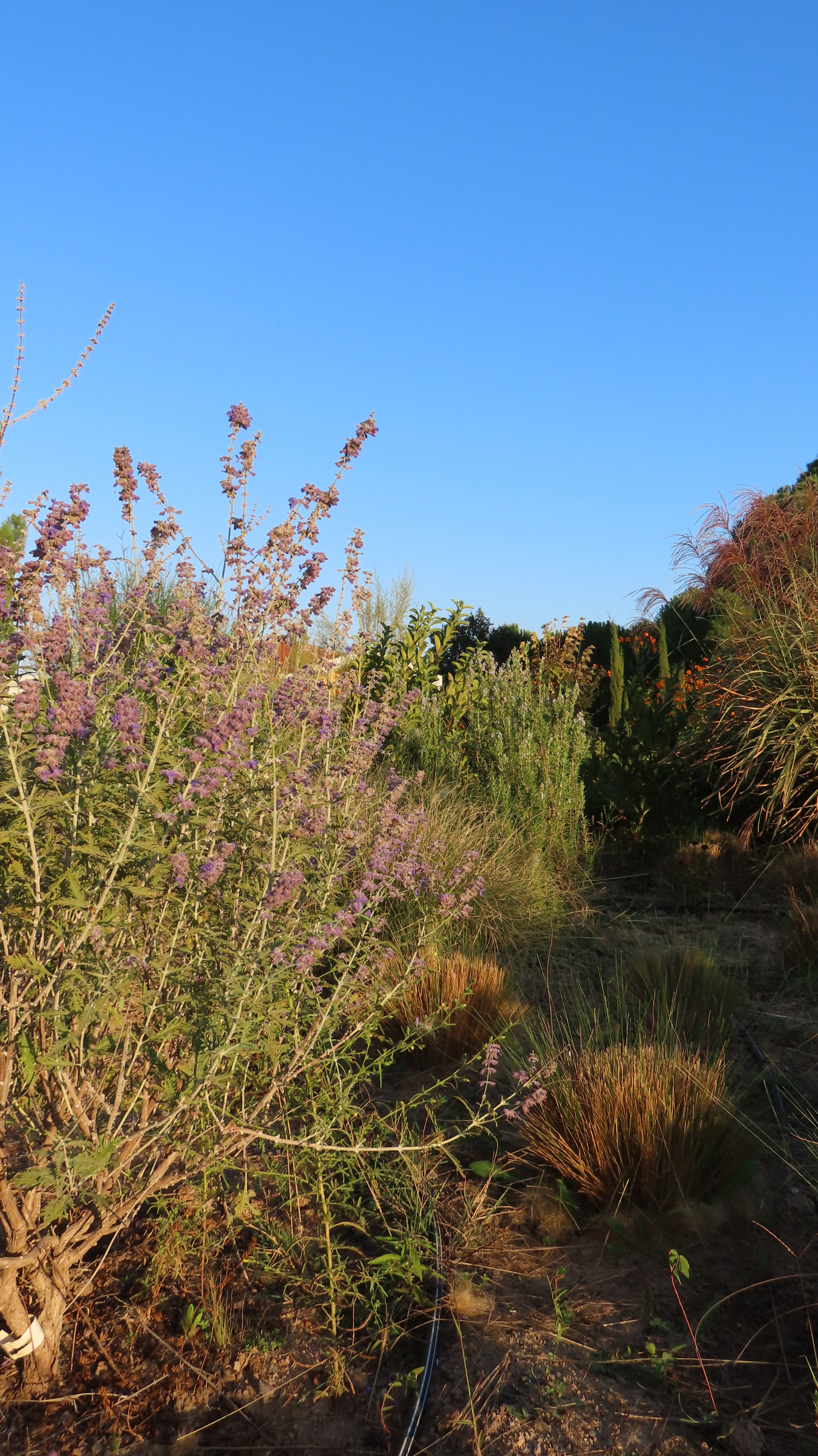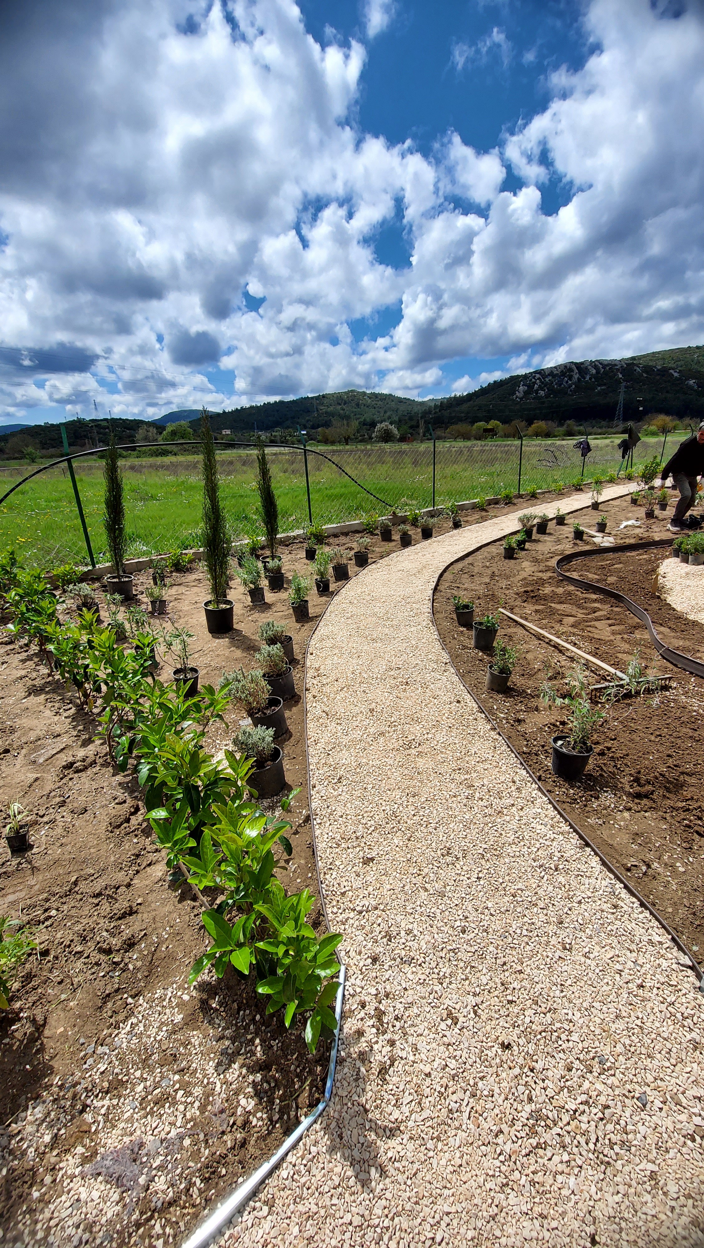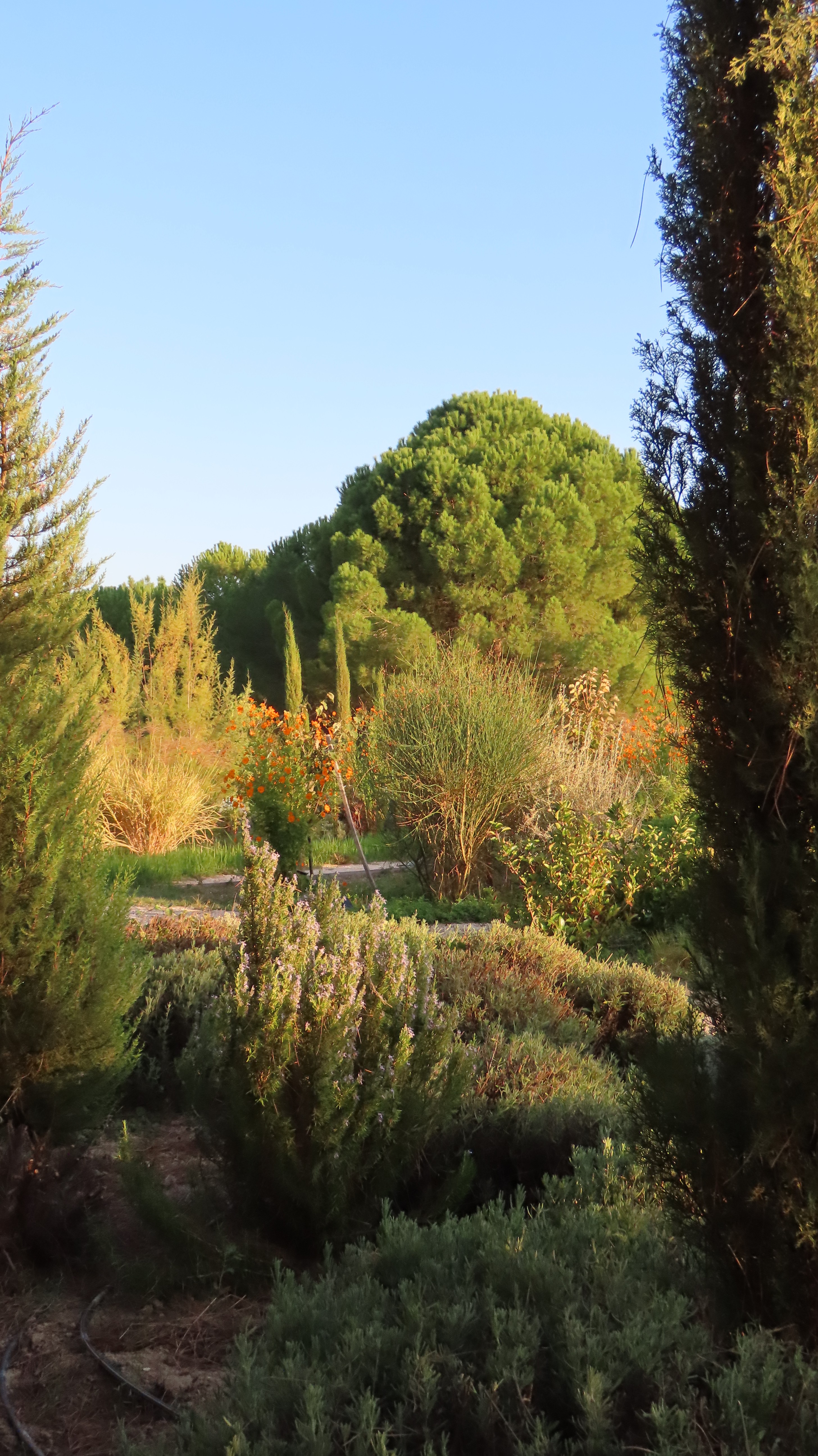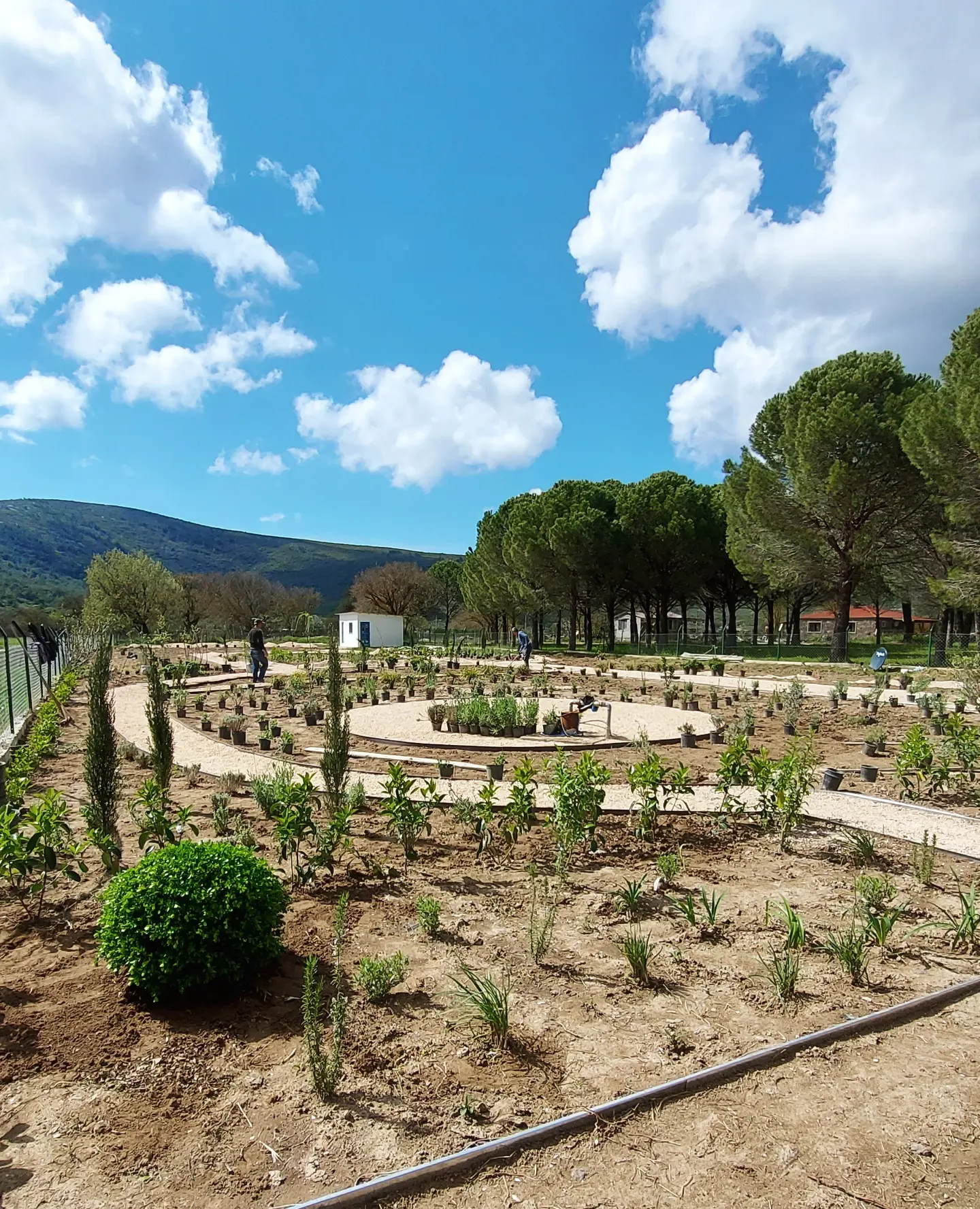 The land carried strong contrasts: in winter, rainfall from the surrounding hills flooded the site, turning soils into swampy ground; in summer, the same soil hardened and cracked under drought, making cultivation difficult. To address this, slight grading adjustments were made, and a network of French drains was installed to channel excess water into an underground tank, where it could be harvested for irrigation during dry months. While regular watering was required in the garden’s first season to establish the young plantings, over time the need gradually diminished as plants settled.