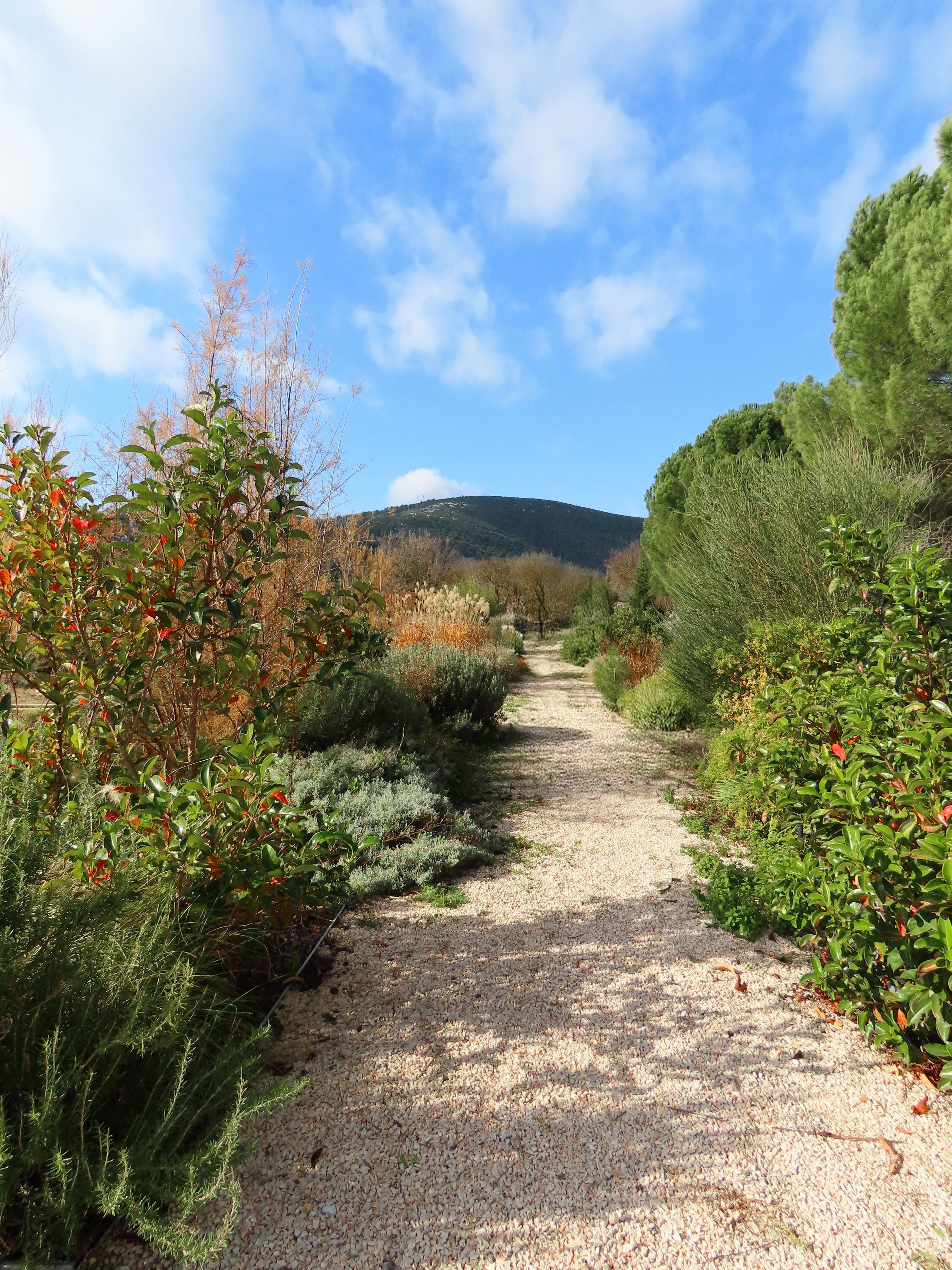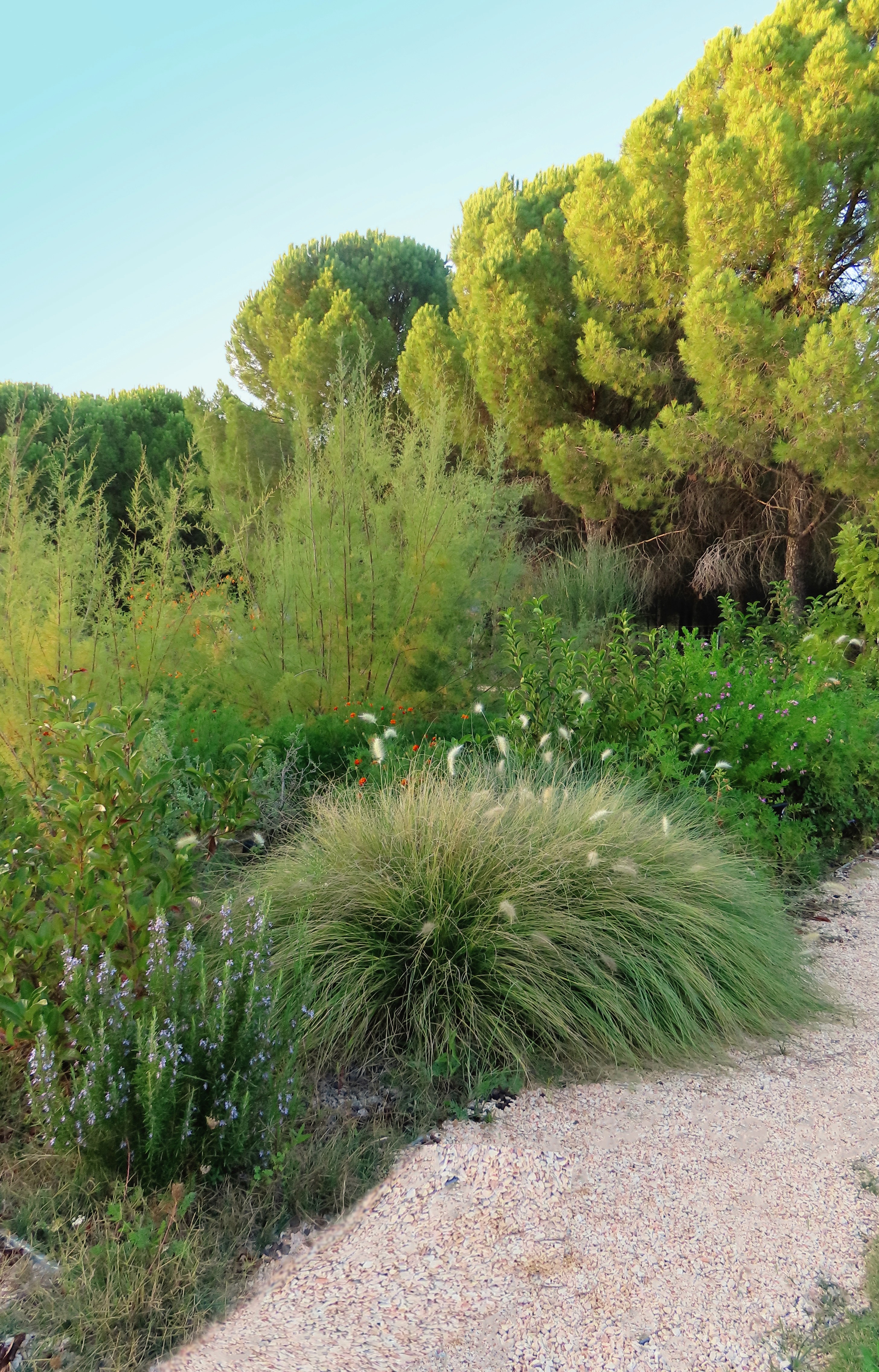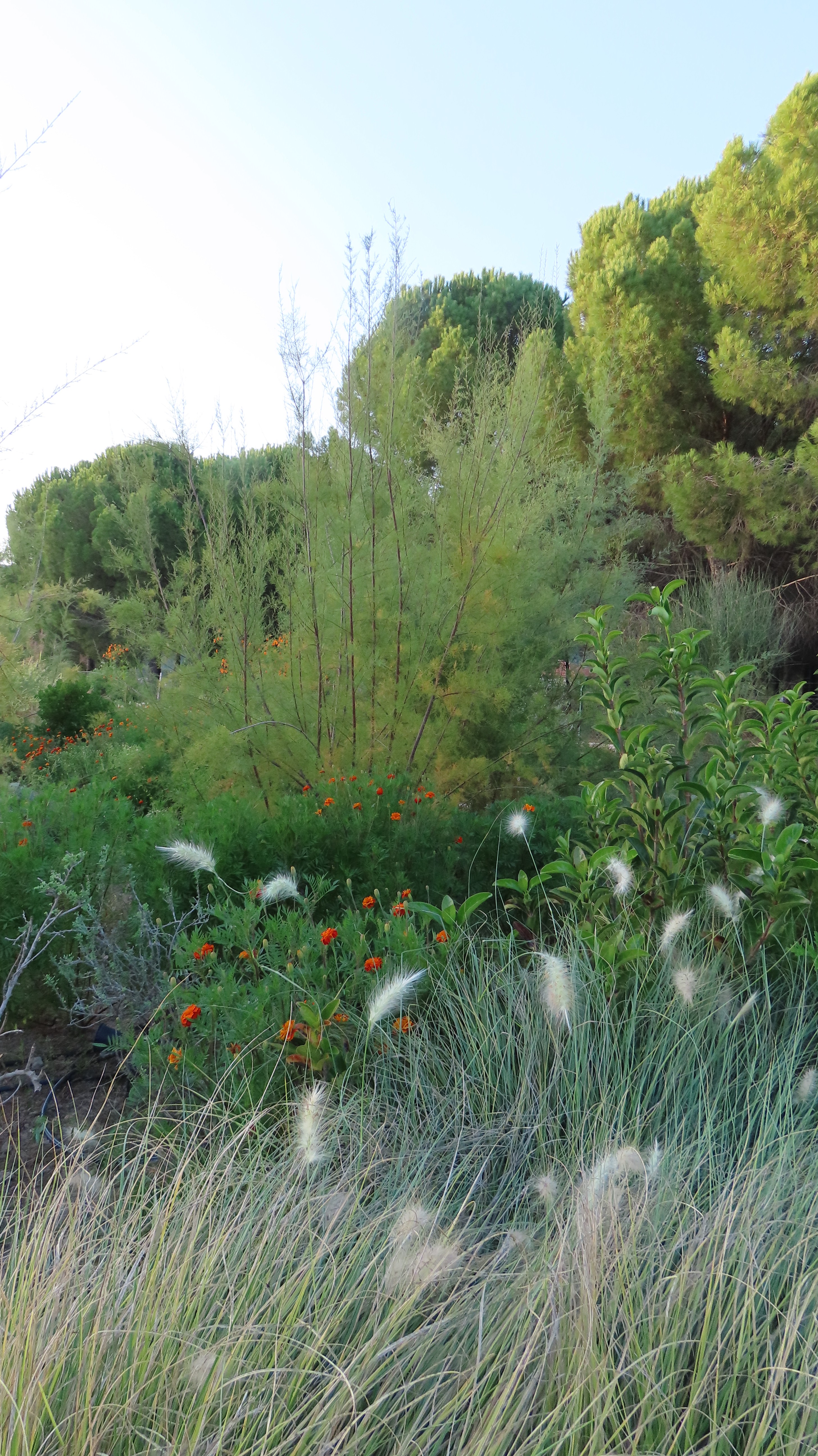 The land carried strong contrasts: in winter, rainfall from the surrounding hills flooded the site, turning soils into swampy ground; in summer, the same soil hardened and cracked under drought, making cultivation difficult. To address this, slight grading adjustments were made, and a network of French drains was installed to channel excess water into an underground tank, where it could be harvested for irrigation during dry months. While regular watering was required in the garden’s first season to establish the young plantings, over time the need gradually diminished as plants settled.