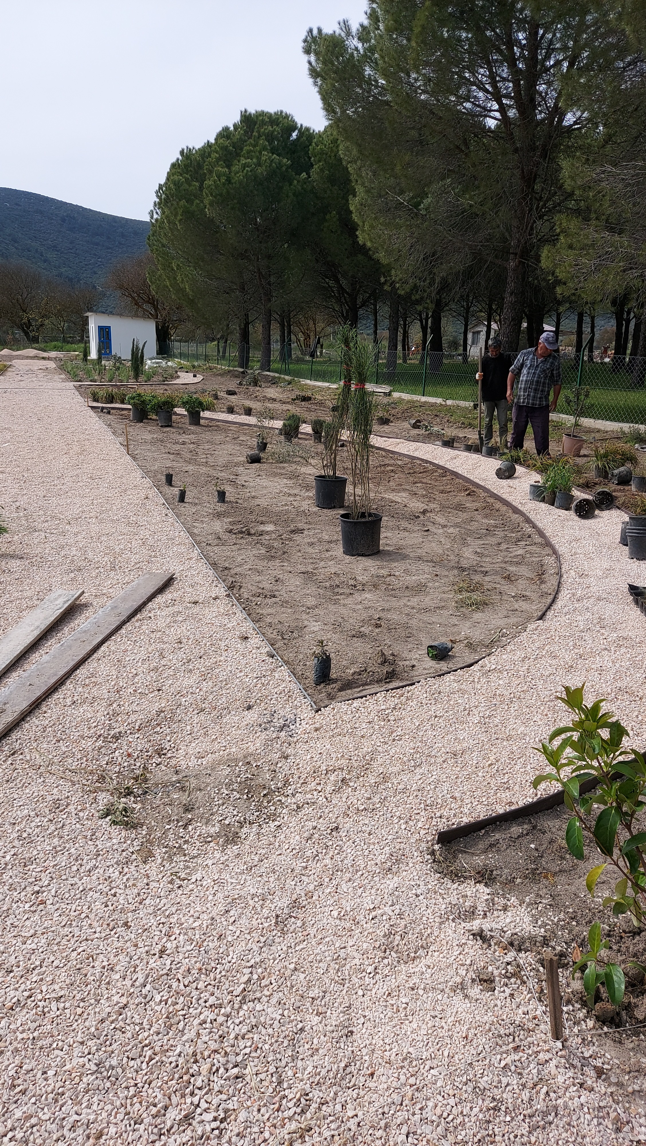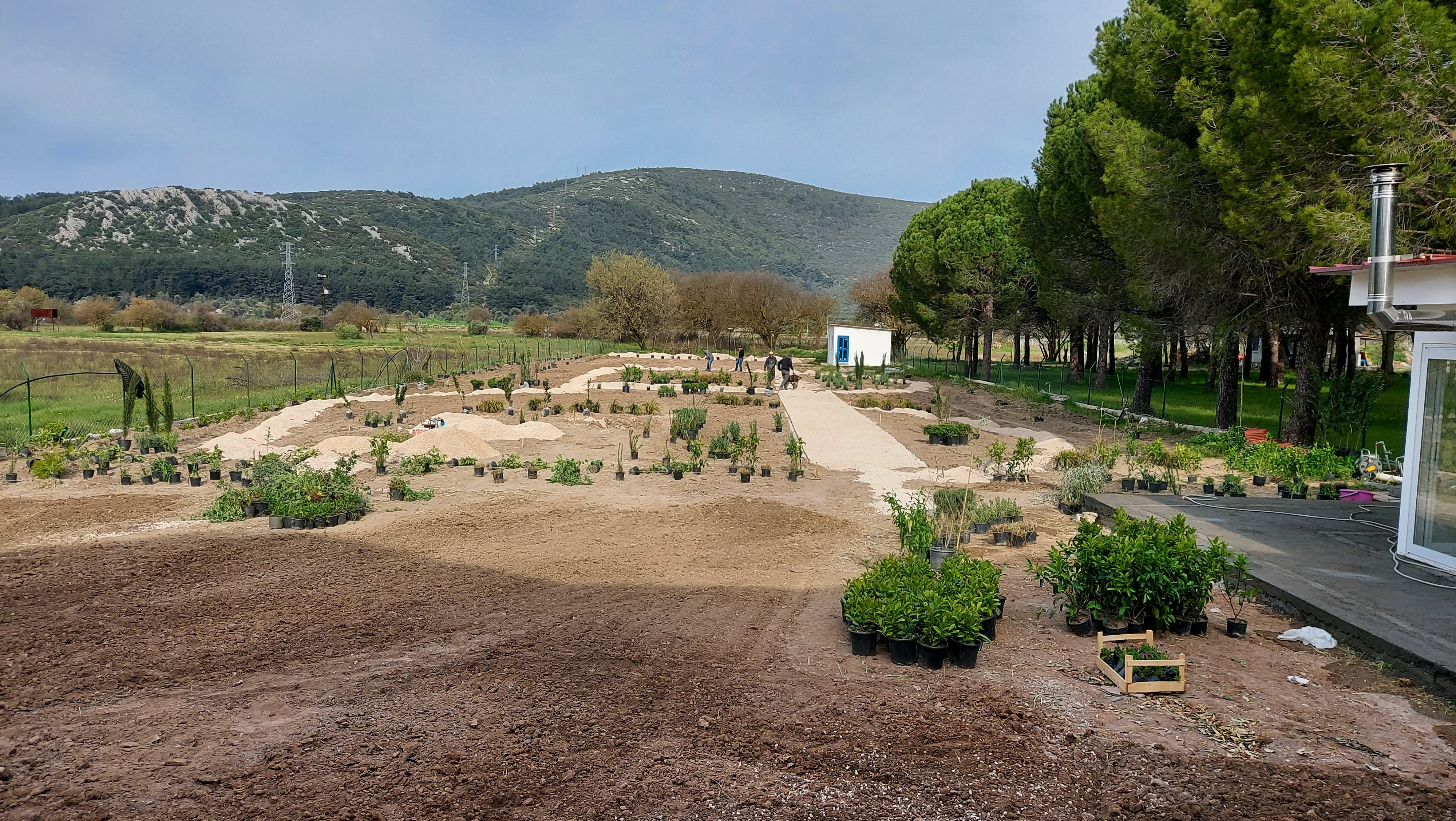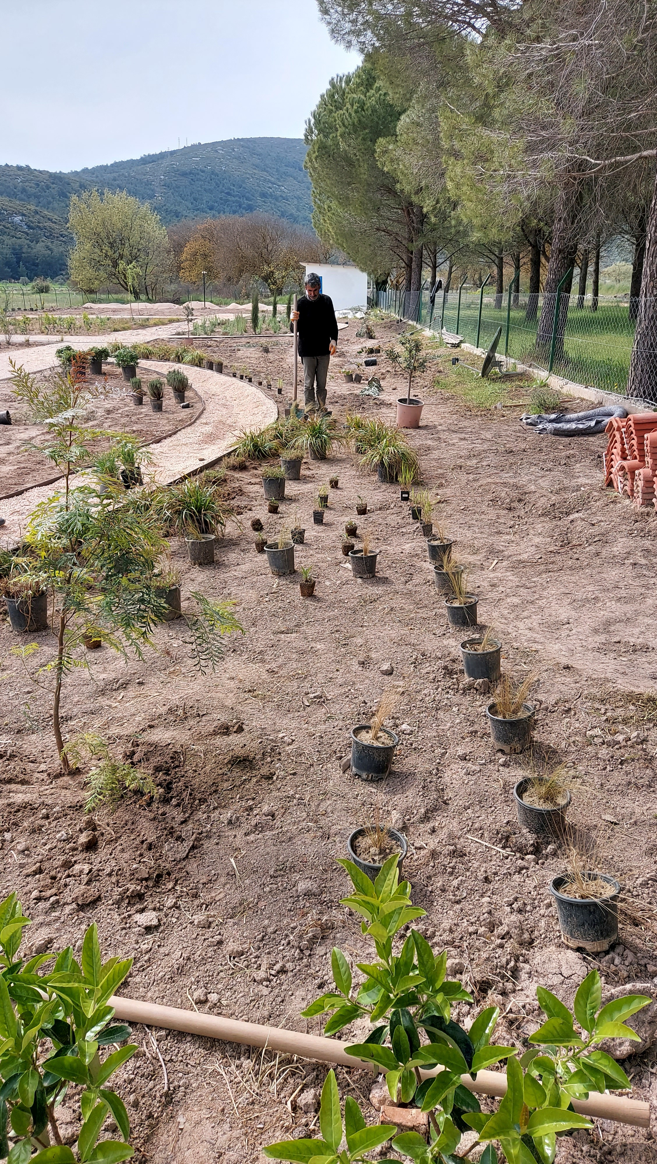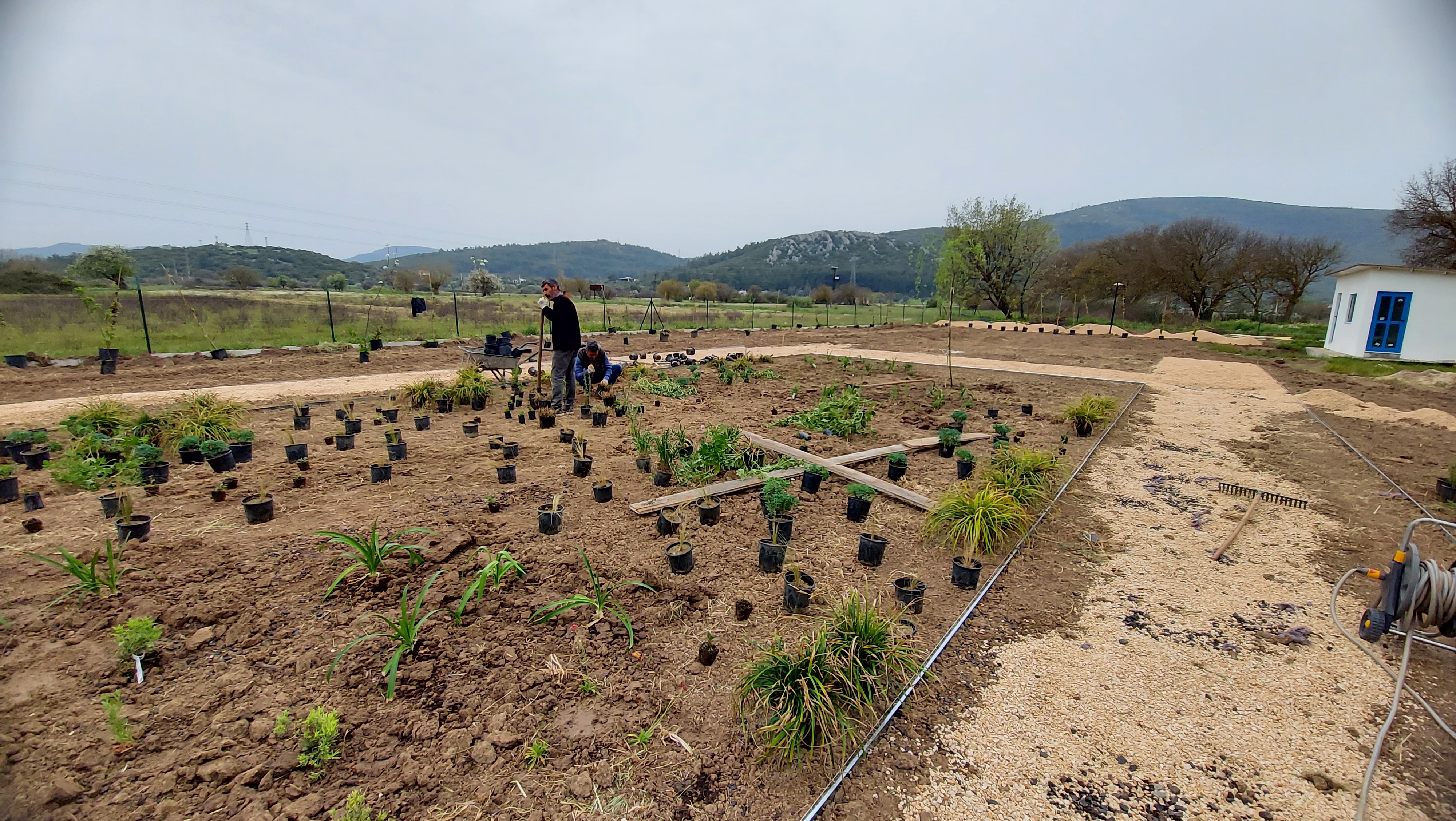 Located in the low plains of Barbaros village, surrounded by low mountains at the heart of the peninsula’s three districts, the 2000 m² site was once used as a melon field. Bordered by woodland to the north, its western edge meets a seasonal winter stream, leaving the land exposed to floods and strong southern winds. The project set out to transform this land into a resilient ecological garden using native and climate-adapted species, creating a landscape that could thrive across seasons while remaining low in maintenance demands.