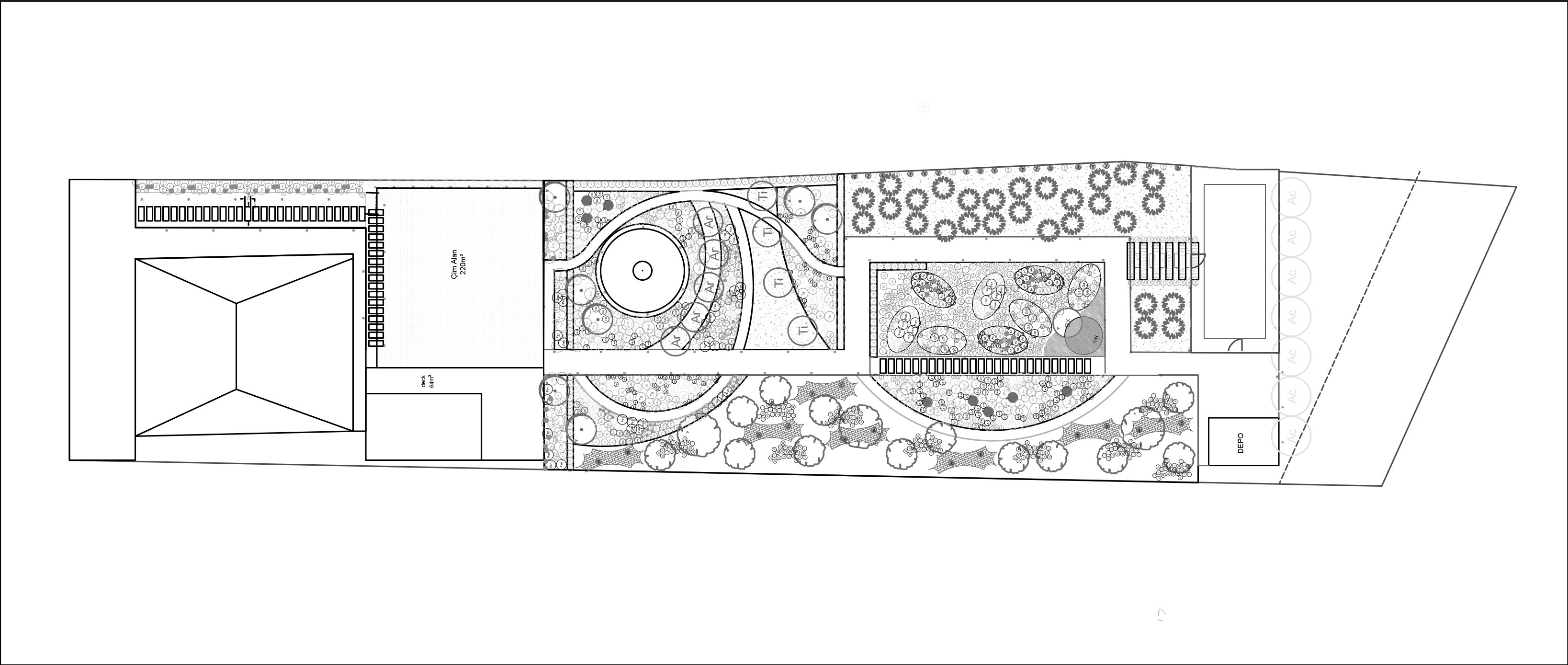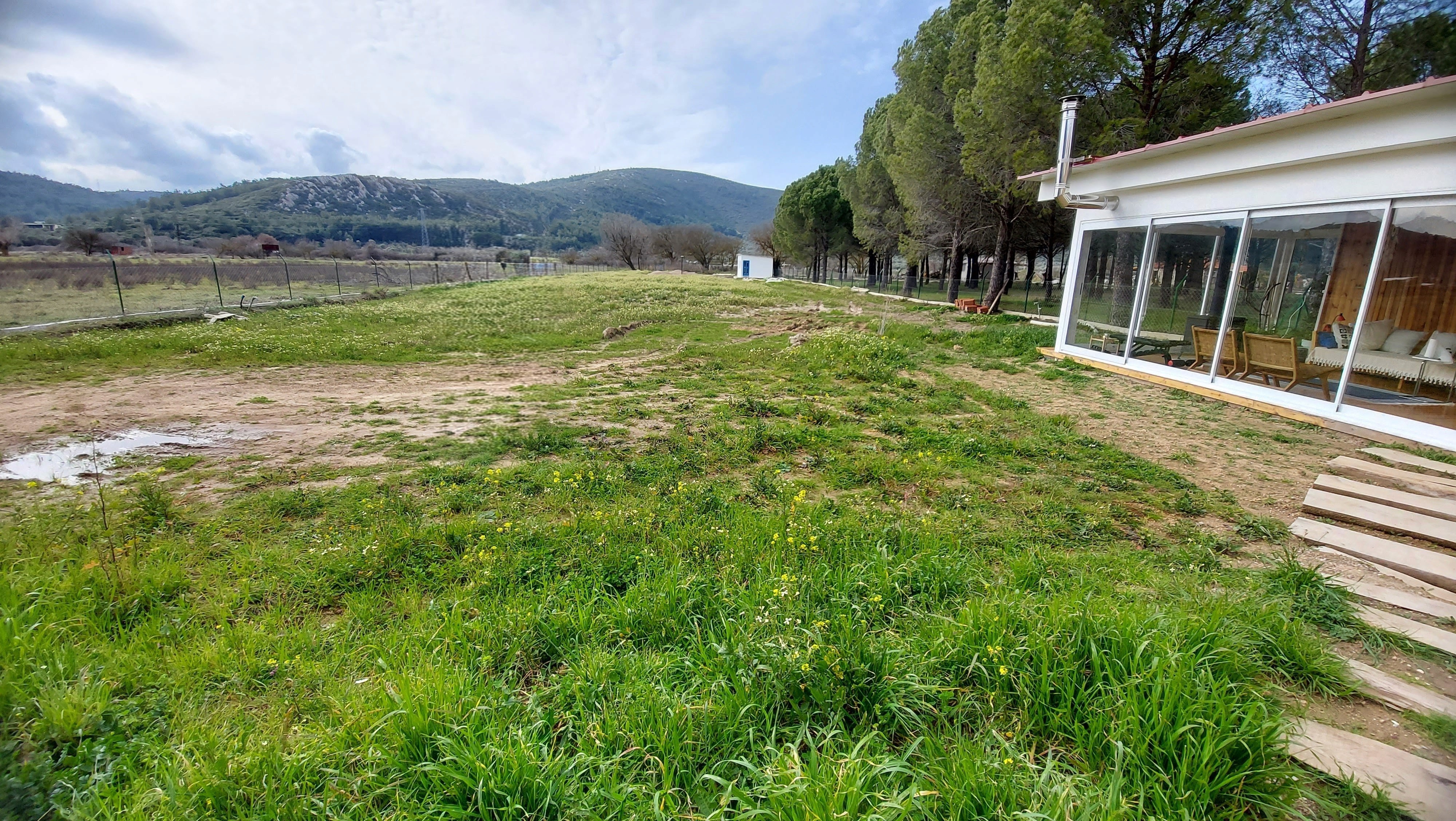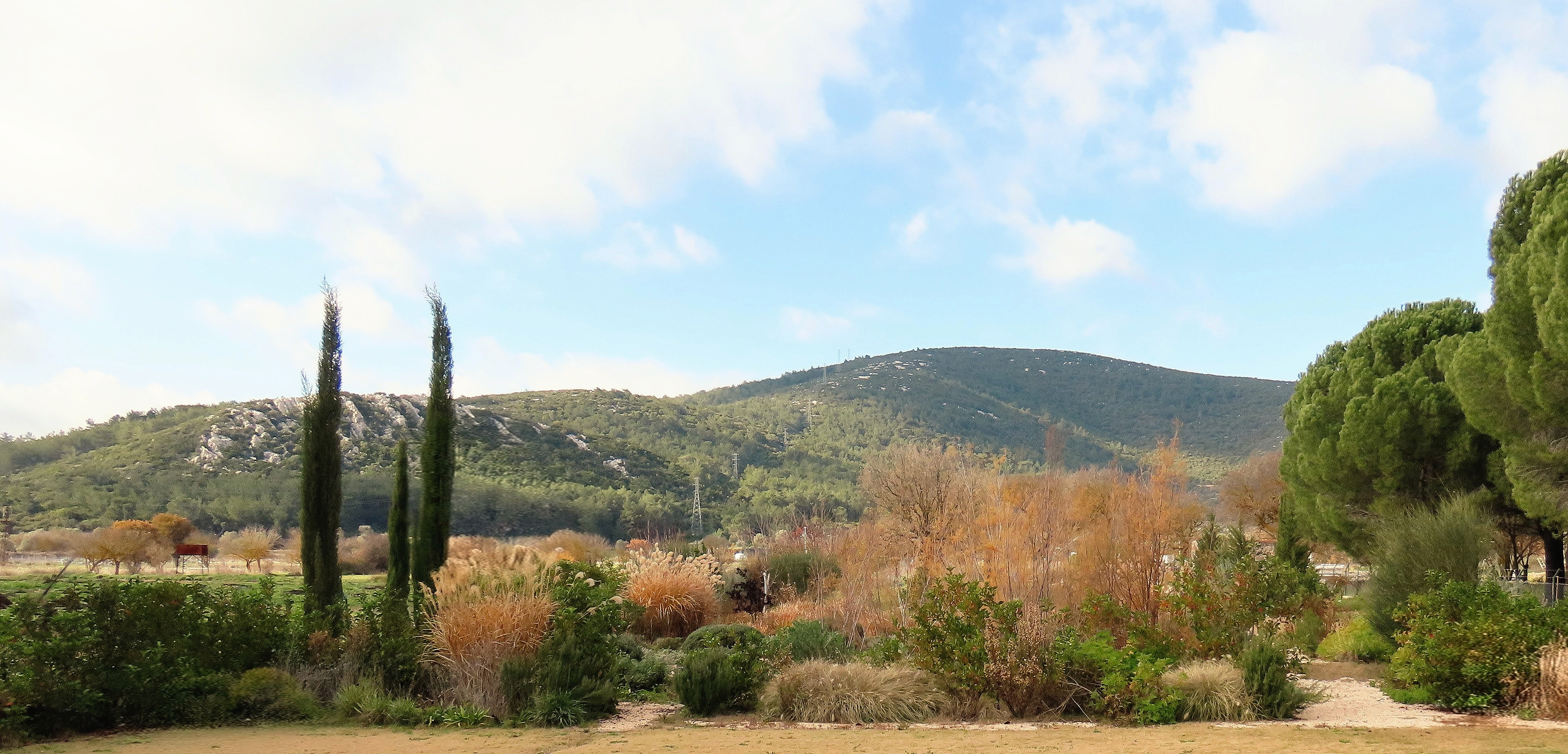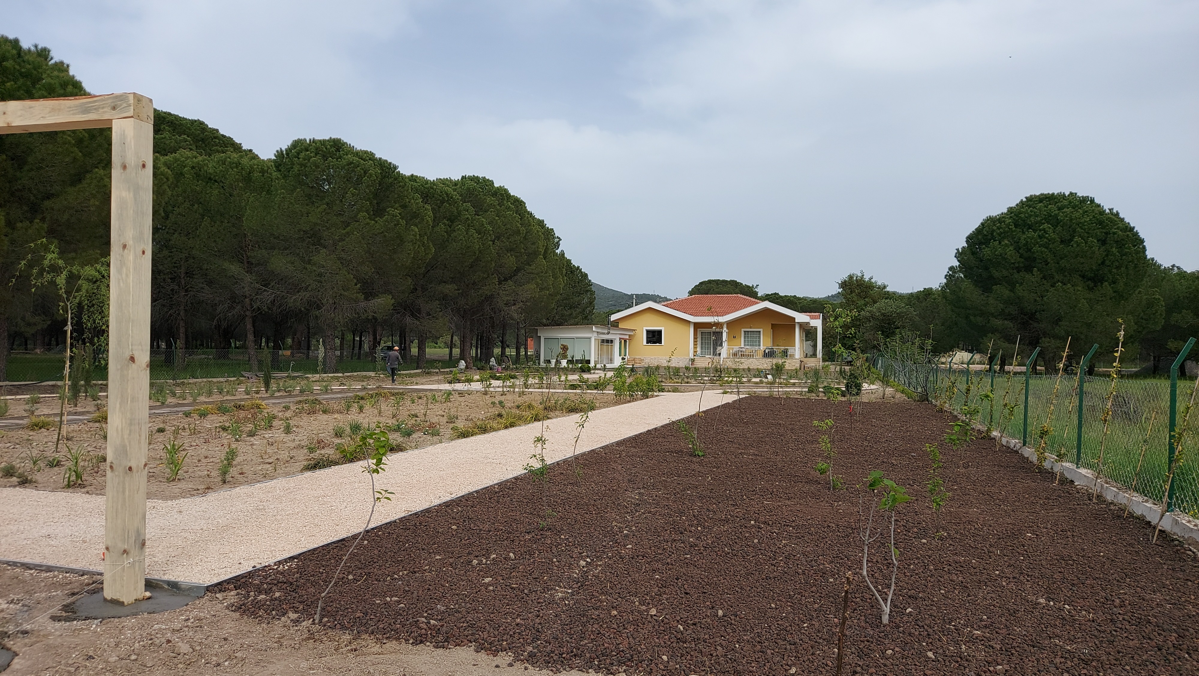 Located in the low plains of Barbaros village, surrounded by low mountains at the heart of the peninsula’s three districts, the 2000 m² site was once used as a melon field. Bordered by woodland to the north, its western edge meets a seasonal winter stream, leaving the land exposed to floods and strong southern winds. The project set out to transform this land into a resilient ecological garden using native and climate-adapted species, creating a landscape that could thrive across seasons while remaining low in maintenance demands.