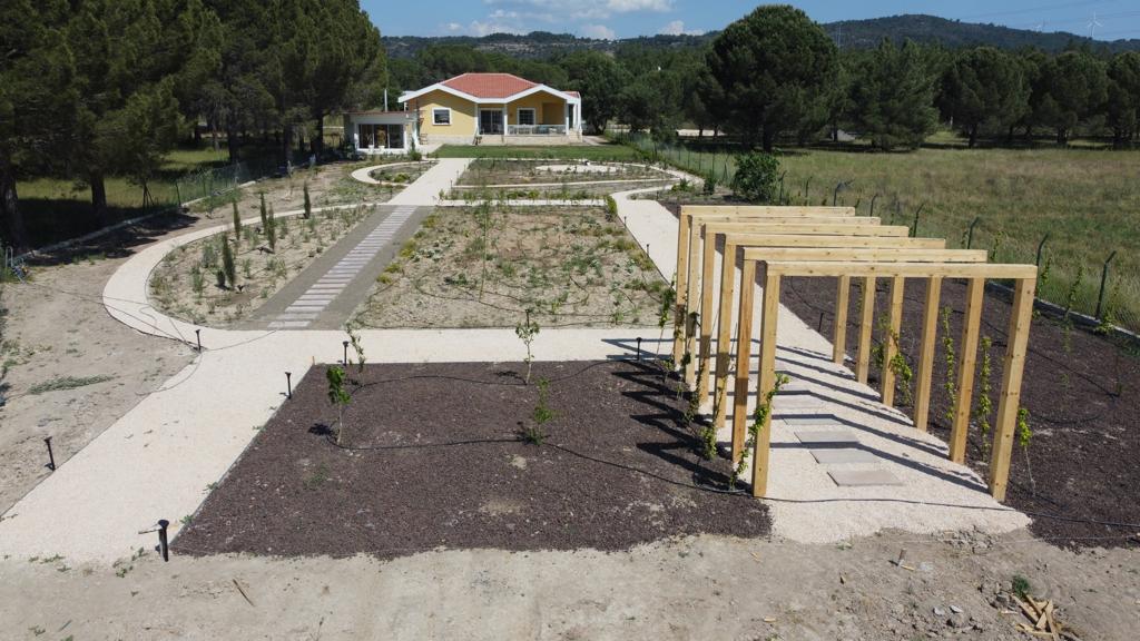 Evergreen trees such as olive and mastic were planted along the northern boundary, while deciduous species such as almond and fig were placed on the southern side to maximize winter daylight across the garden. The planting scheme combined aromatic herbs, culinary and medicinal perennials, grasses, vines, and a wildflower meadow mix, alongside a dedicated vegetable growing area. Together, they shaped a garden that balances productivity, habitat, and human well-being.