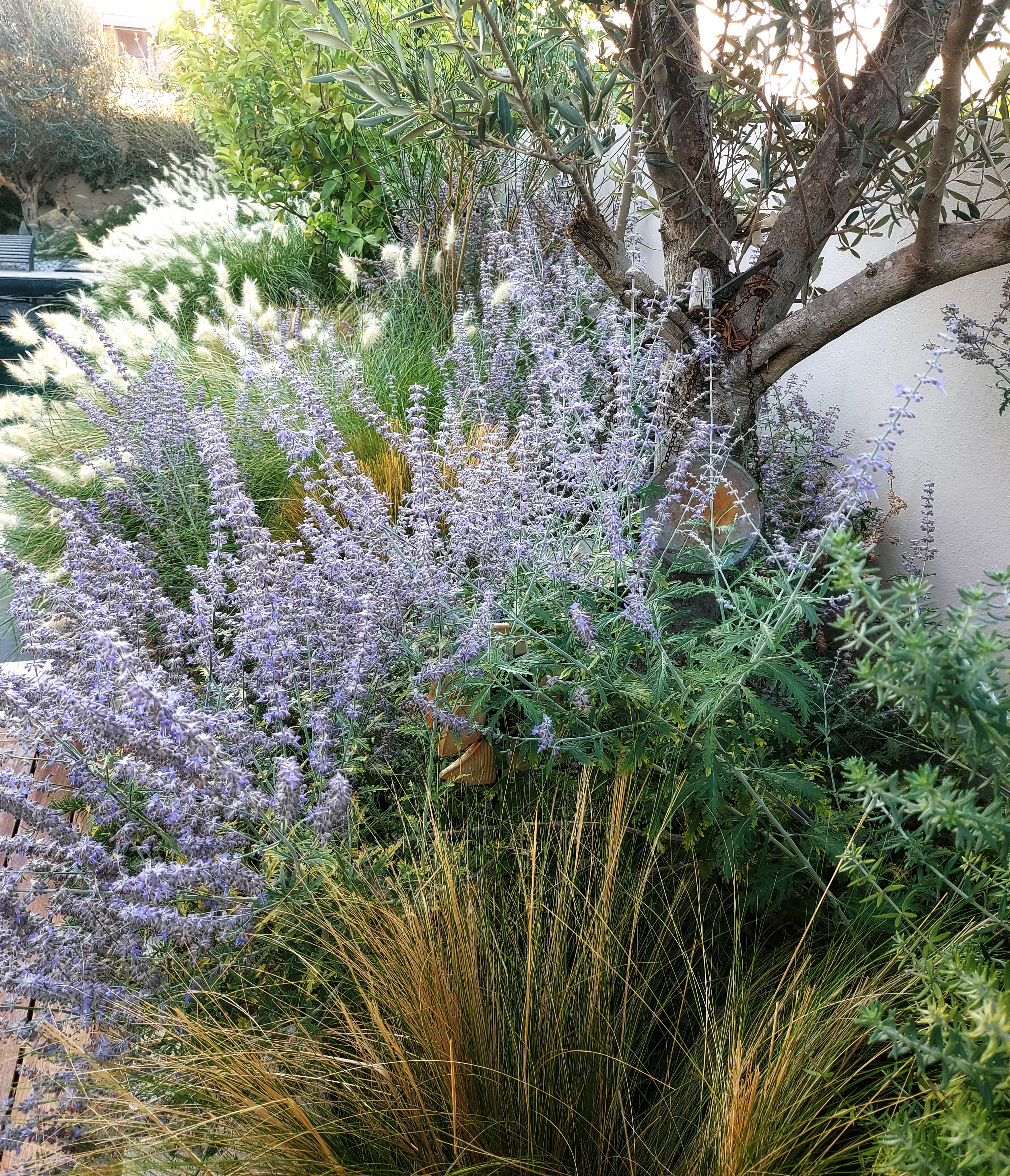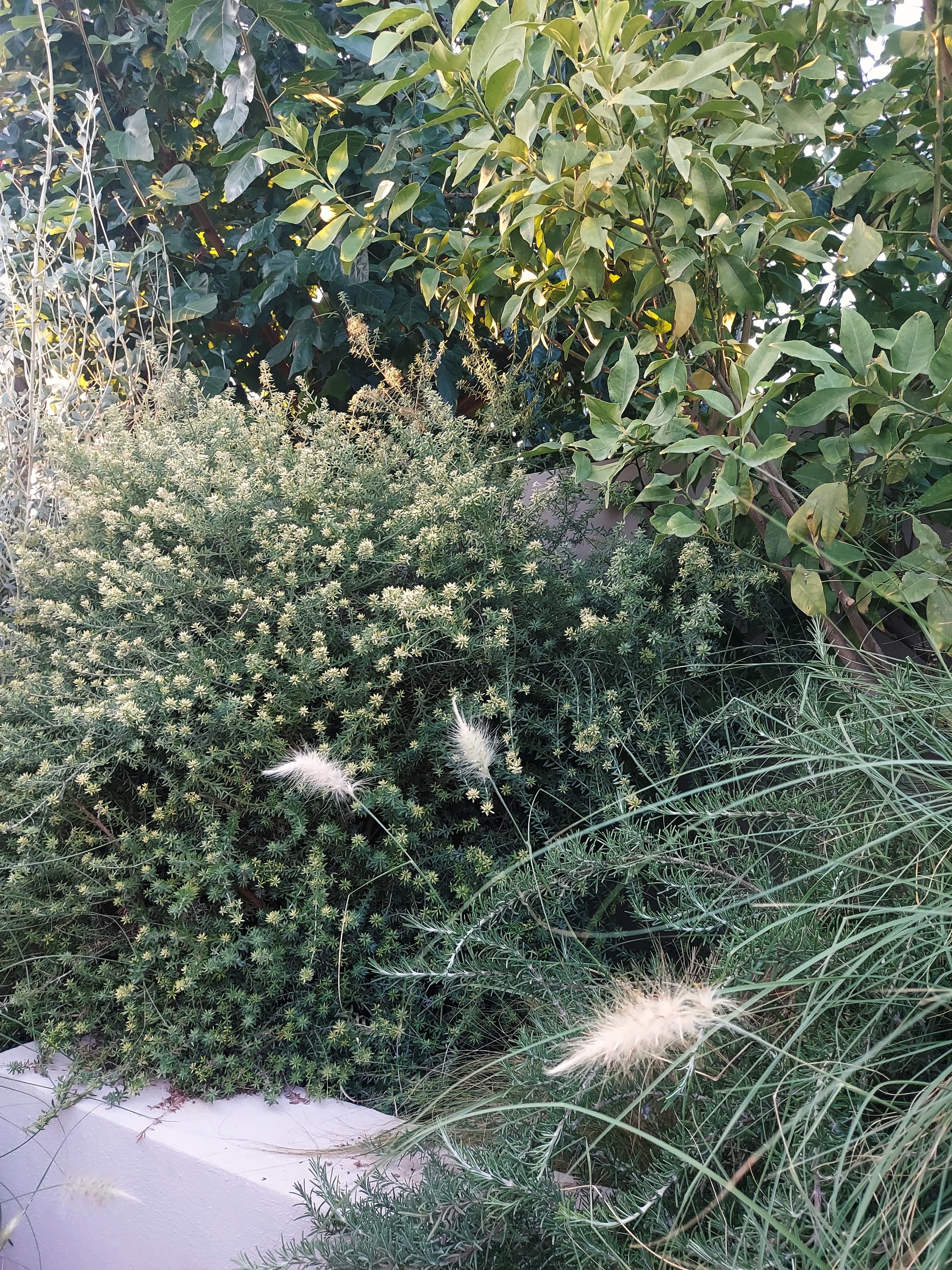Within a few months, the poolside garden established vigorously: fast-growing grasses filled the space quickly while slower species such as creeping rosemary took hold. The result is a dense, textural landscape that aromatic, and immersive where movement through the pathways becomes a sensory experience.