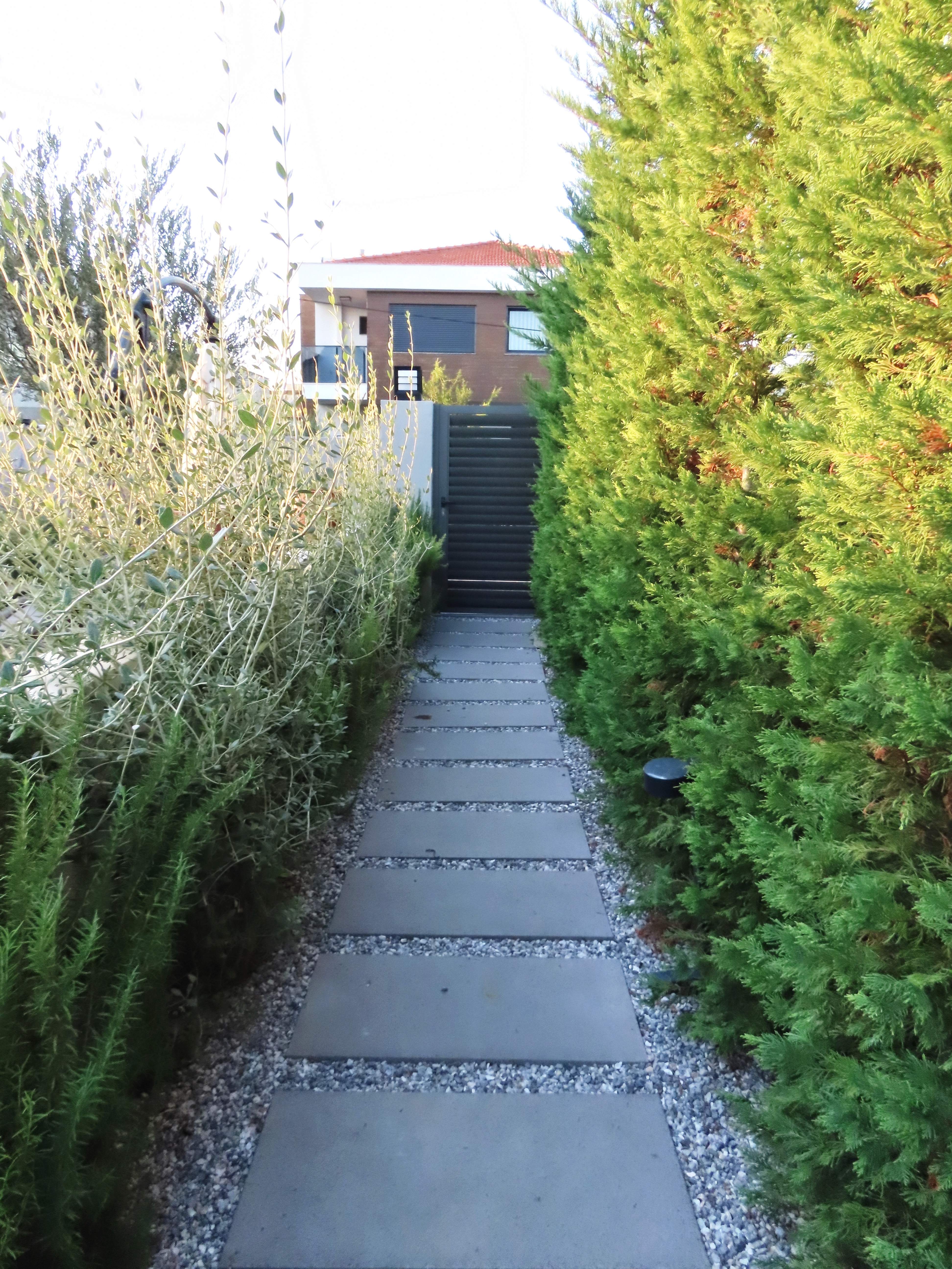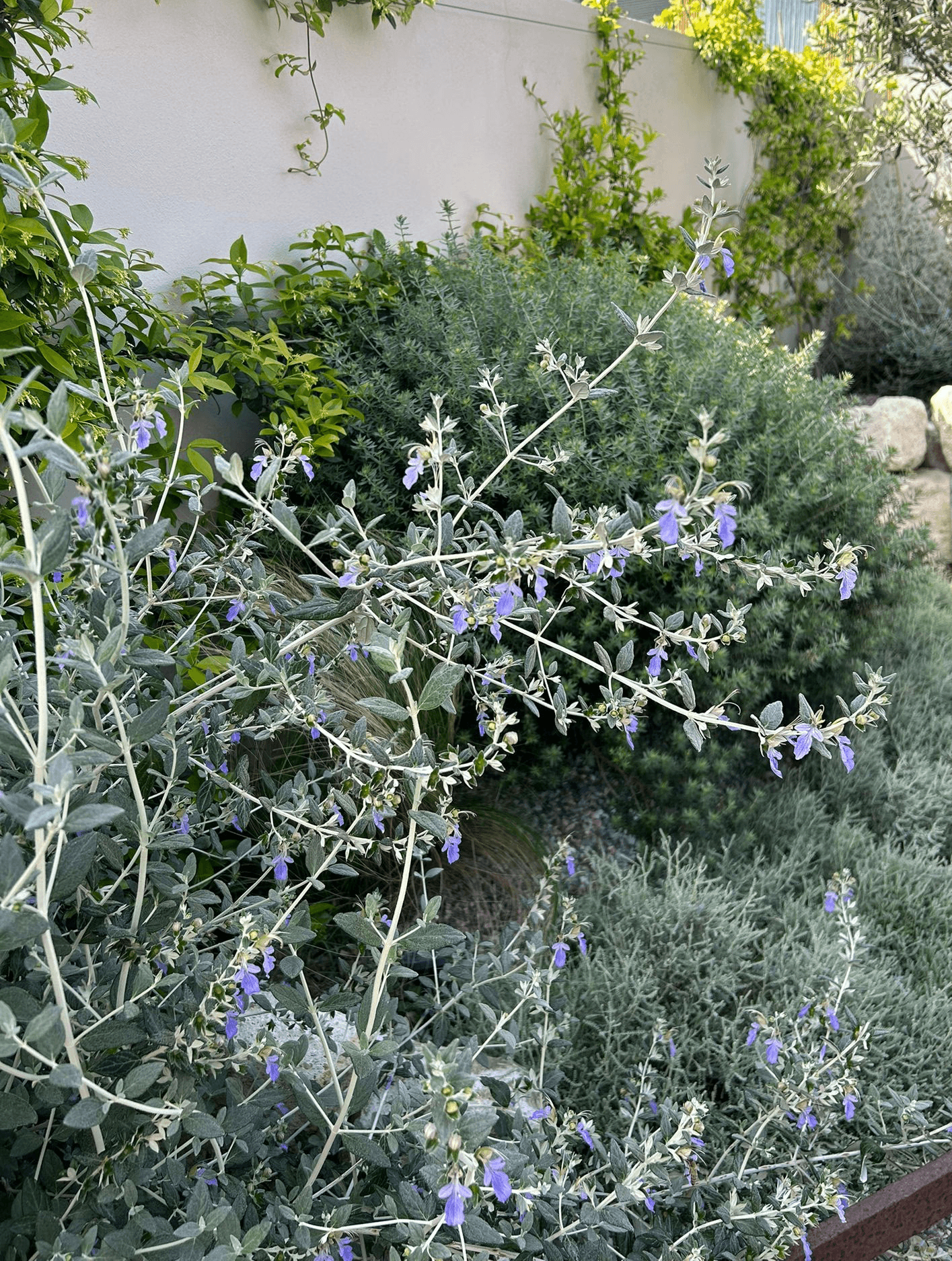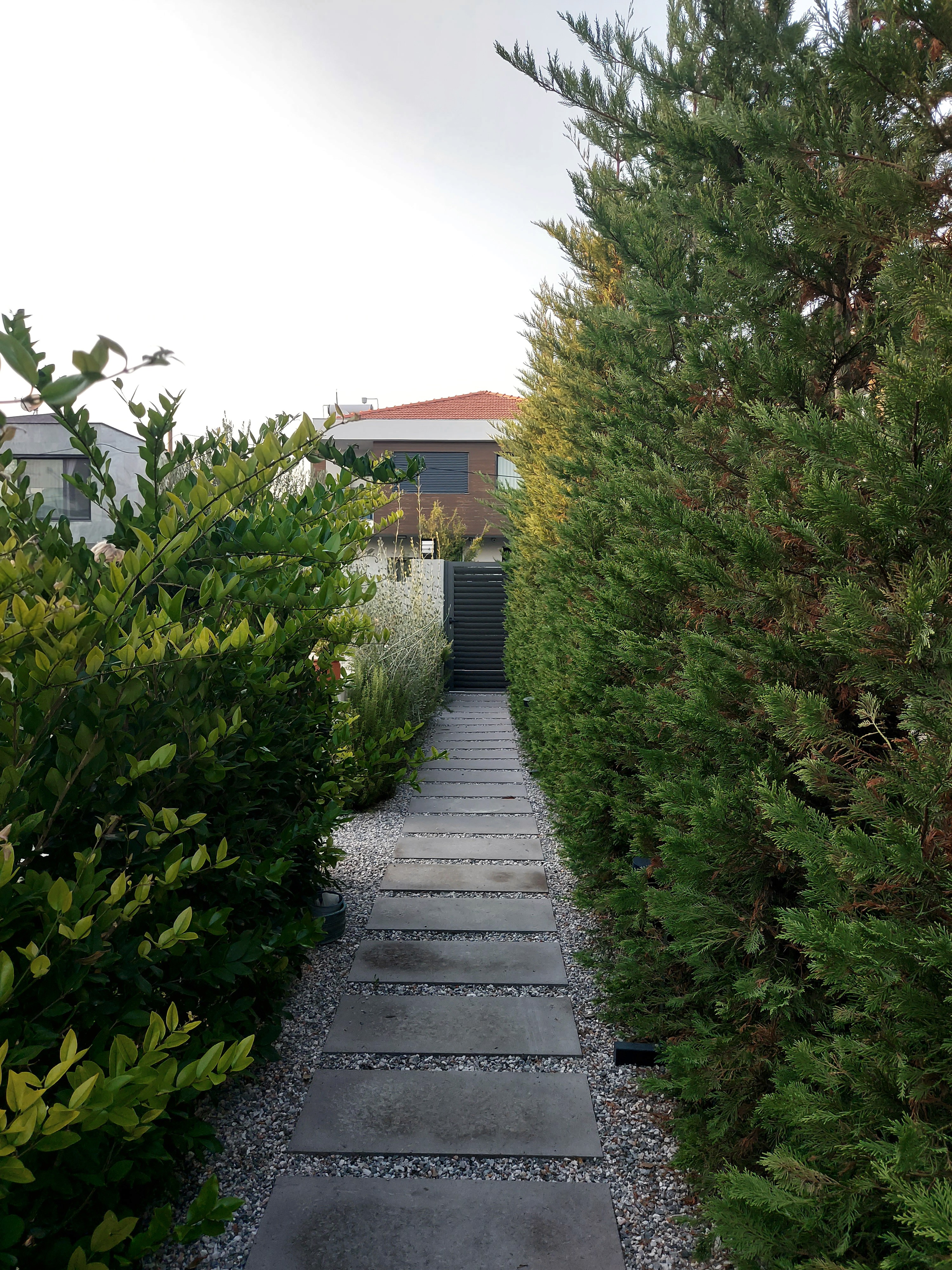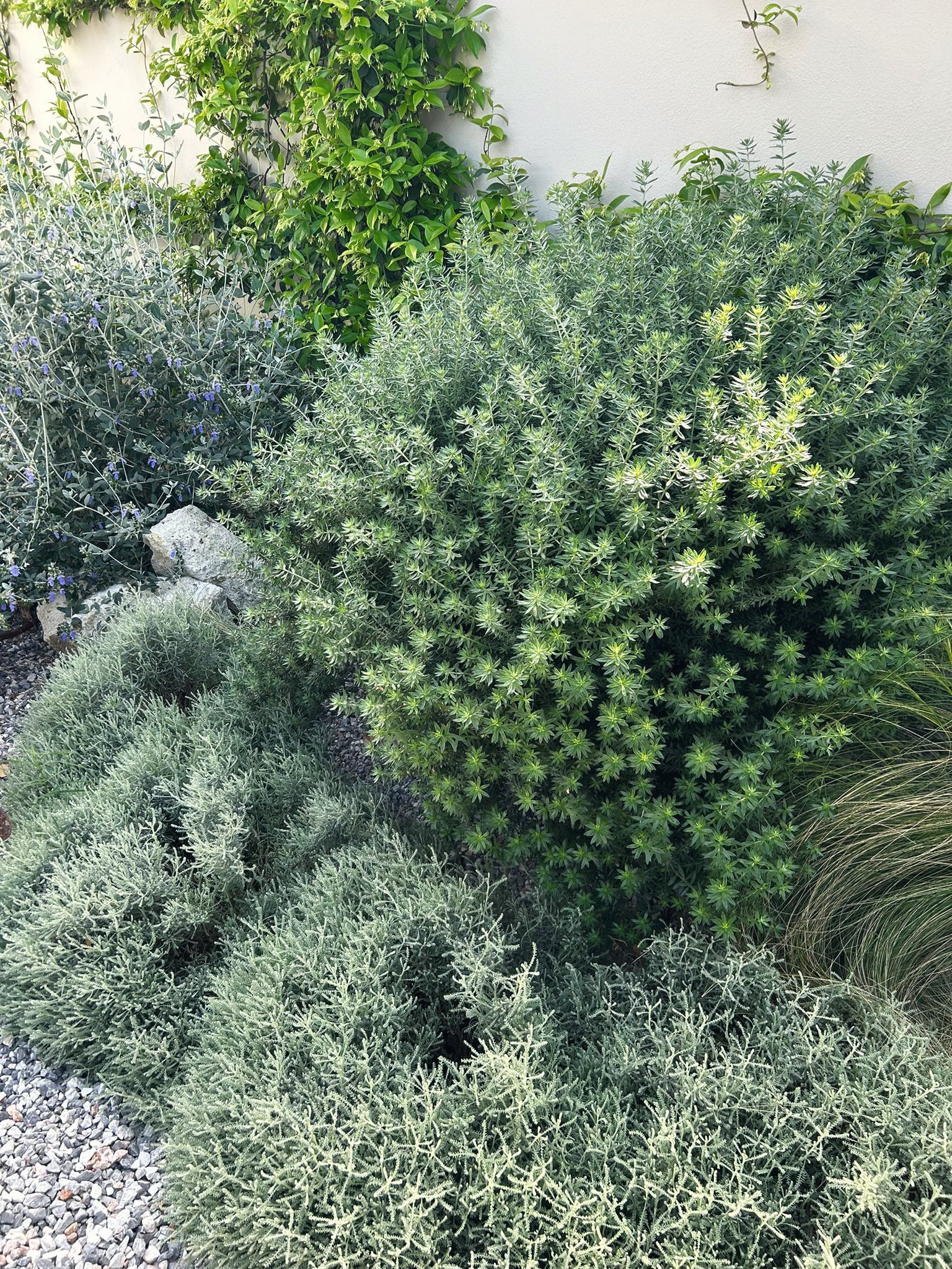 The design draws from the calm tones of the Mediterranean landscape. Silvery foliage, soft greens, and muted textures define the base palette, while darker evergreens create contrast and depth. This interplay of cool and dark tones shapes the garden’s atmosphere: calm yet grounded, reflective yet lush. In daylight and moonlight, the foliage catches light like brushed metal, while the gray and white gravel enhances the garden’s quiet luminosity. As the seasons turn, ornamental grasses shift to golden hues, adding warmth and movement to an otherwise cool composition.