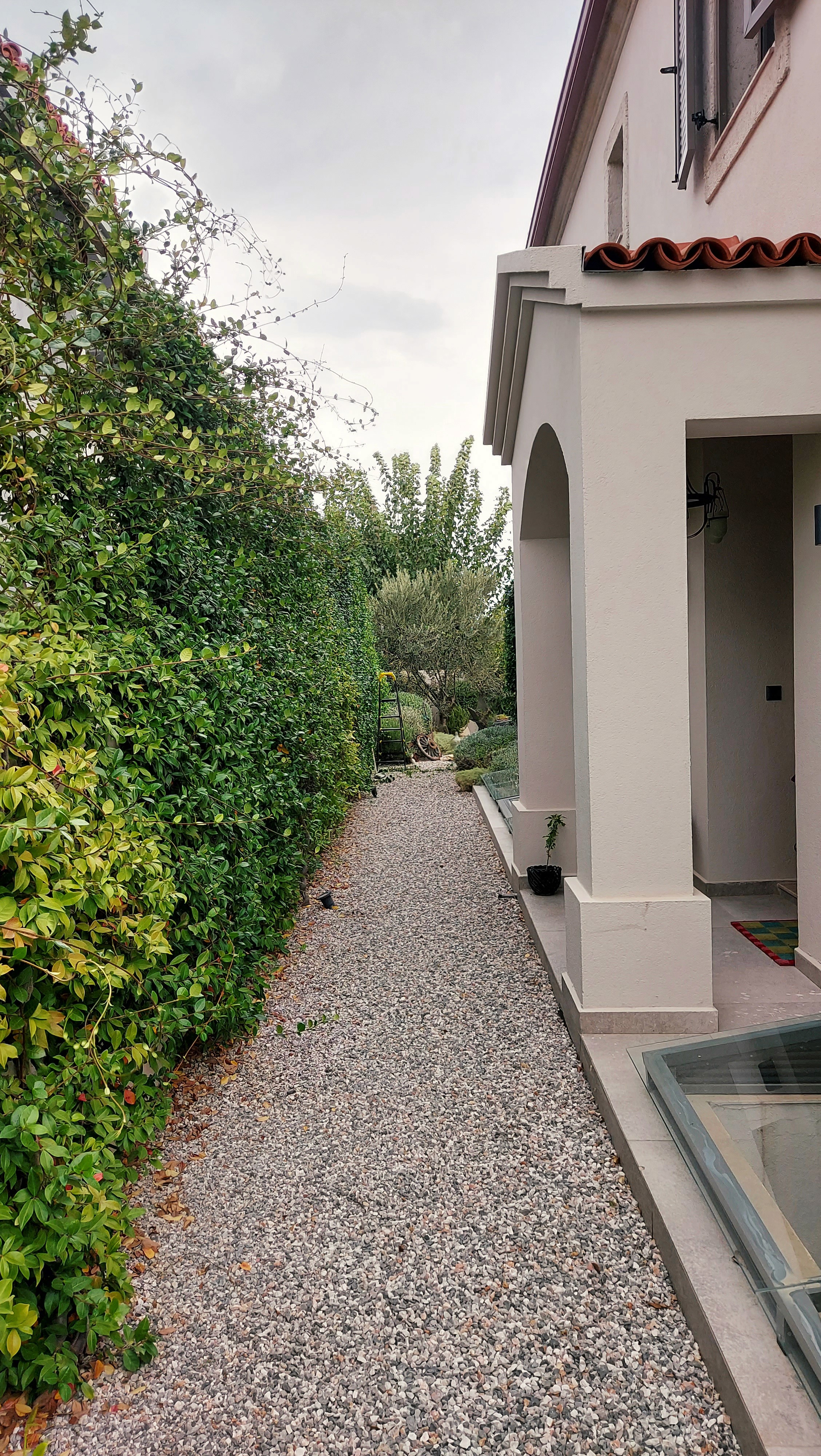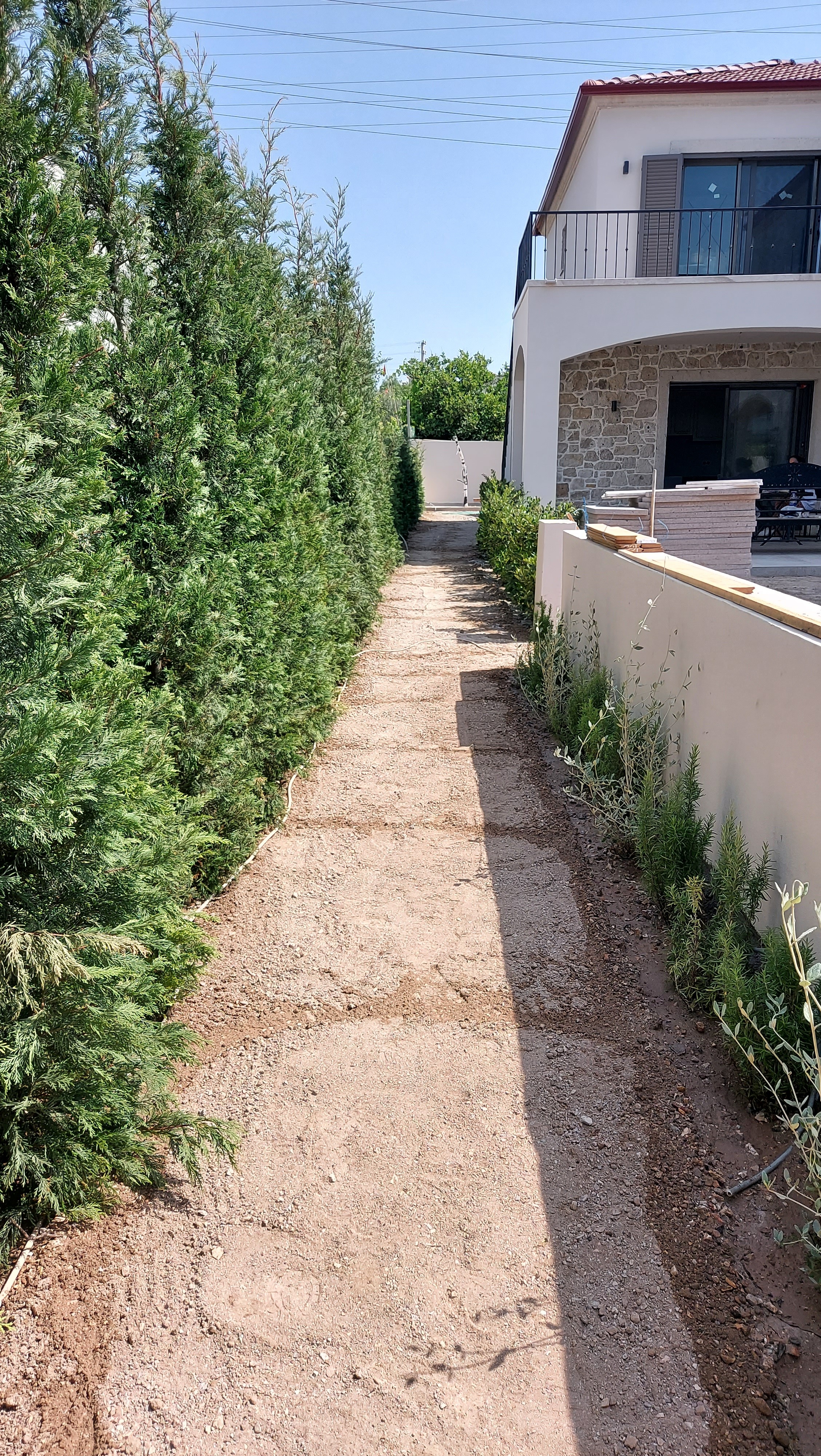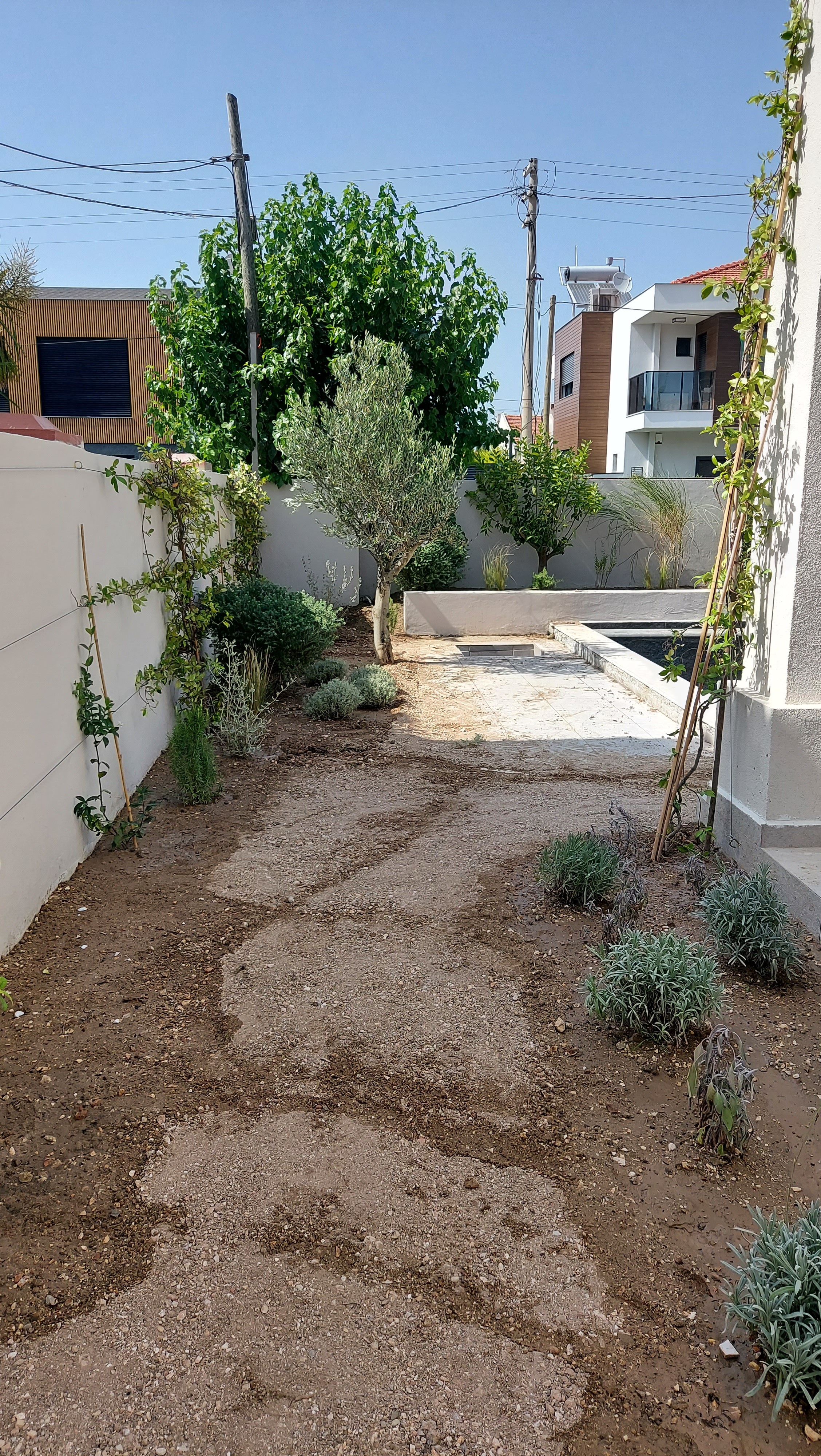 Designed around a newly built house on a flat, stone-walled plot, the site receives full sun and partial protection from northern winds, allowing distinct planting zones to form around the house and pool. On the north side, between the pool and the boundary wall, citrus trees benefit from southern light while remaining sheltered from wind. The lower southern edge of the plot carries fruit trees and lavender in a looser, more seasonal composition. Mediterranean shrubs define subtle transitions between areas, balancing productivity with visual depth.