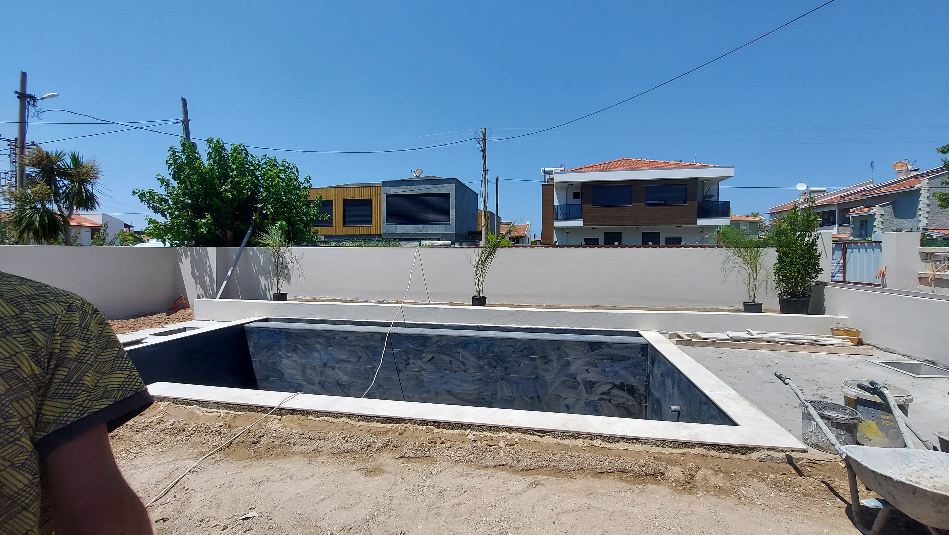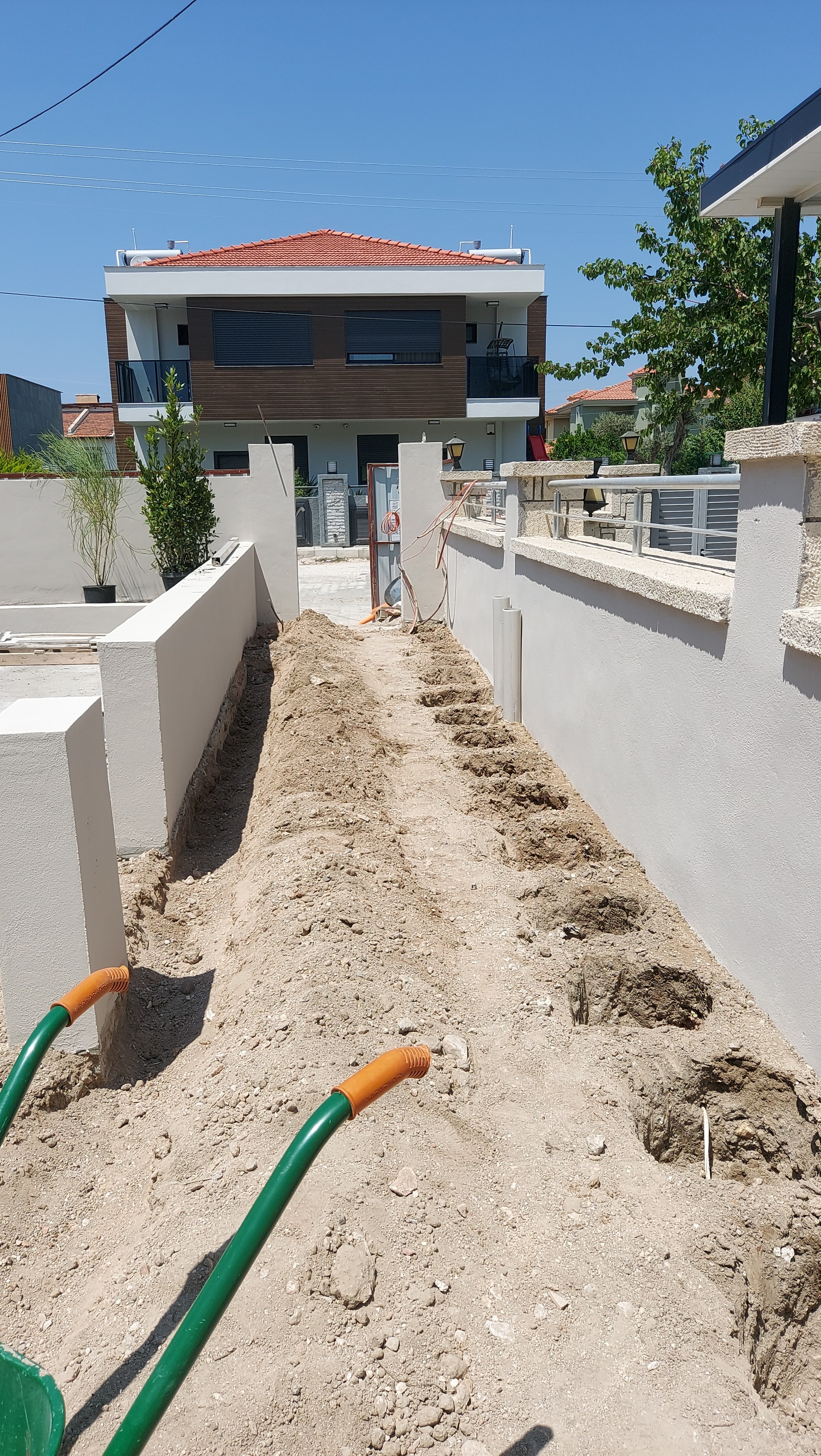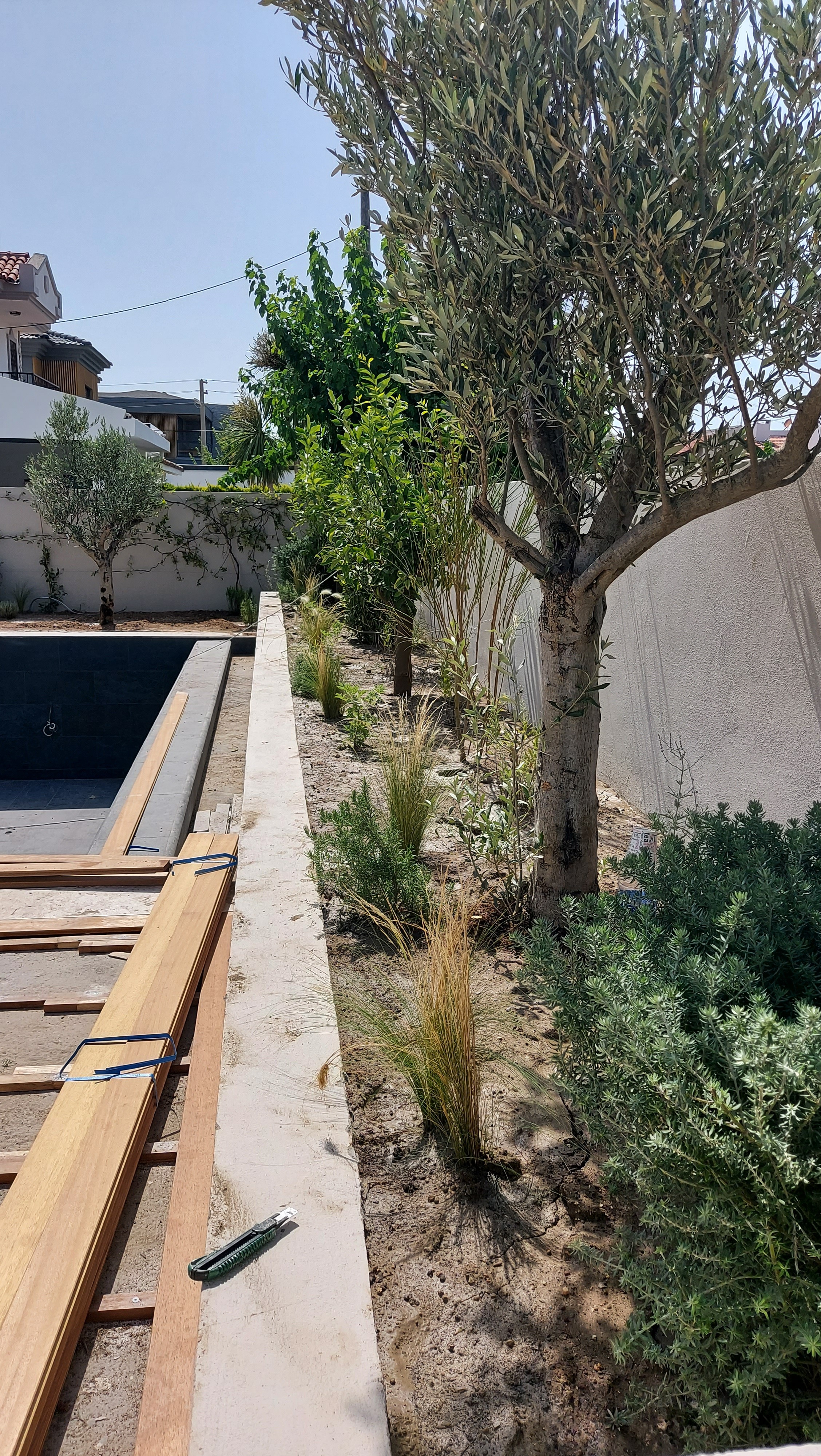 Designed around a newly built house on a flat, stone-walled plot, the site receives full sun and partial protection from northern winds, allowing distinct planting zones to form around the house and pool. On the north side, between the pool and the boundary wall, citrus trees benefit from southern light while remaining sheltered from wind. The lower southern edge of the plot carries fruit trees and lavender in a looser, more seasonal composition. Mediterranean shrubs define subtle transitions between areas, balancing productivity with visual depth.